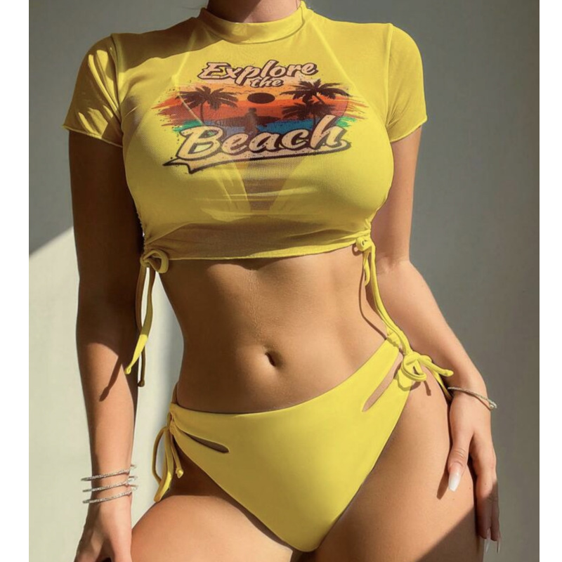 2024 new European and American cross-border solid color bikini outer wear printed mesh short sleeve sexy three-piece swimsuit for women