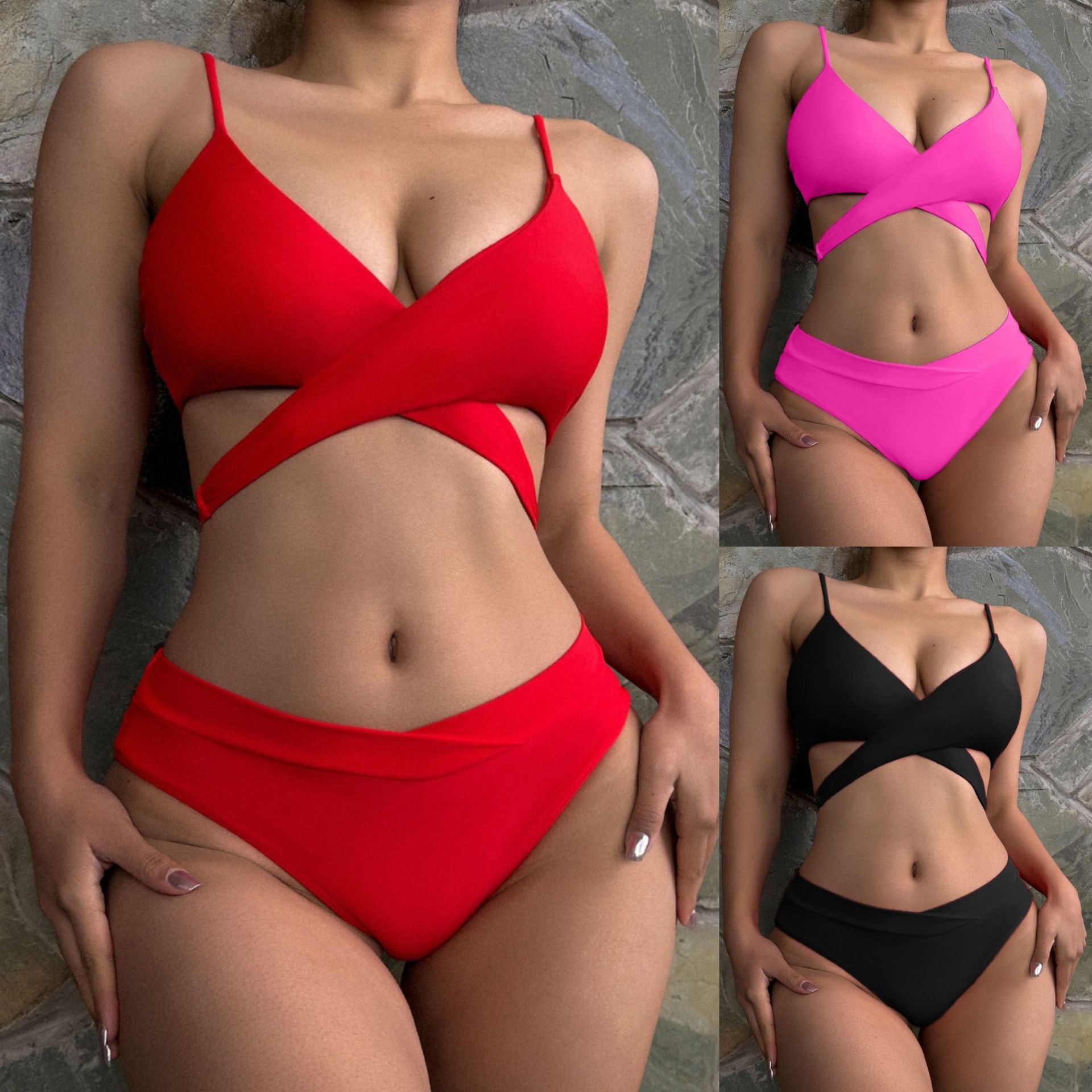 | nameOriginal | 2024 new European and American Foreign trade solid color cross lace-up push up backless sexy fashion bikini split swimsuit for women |