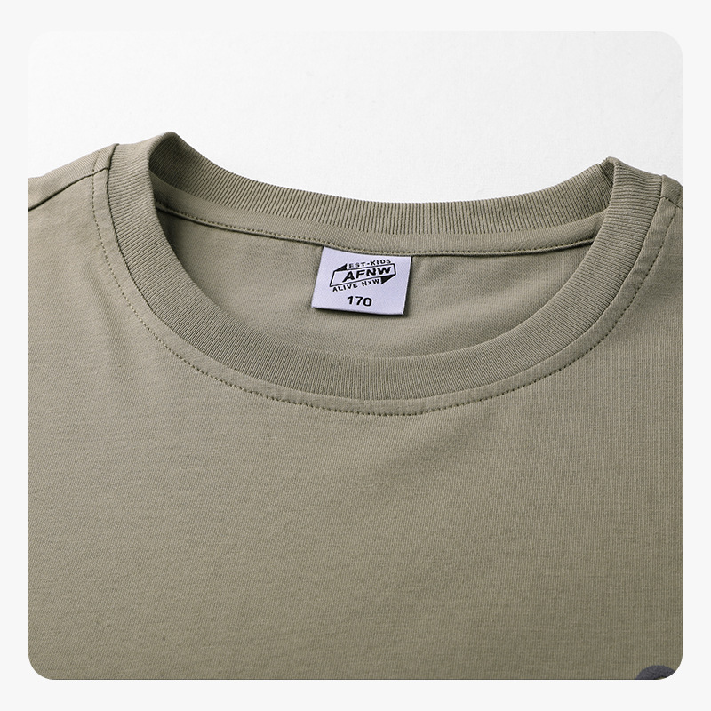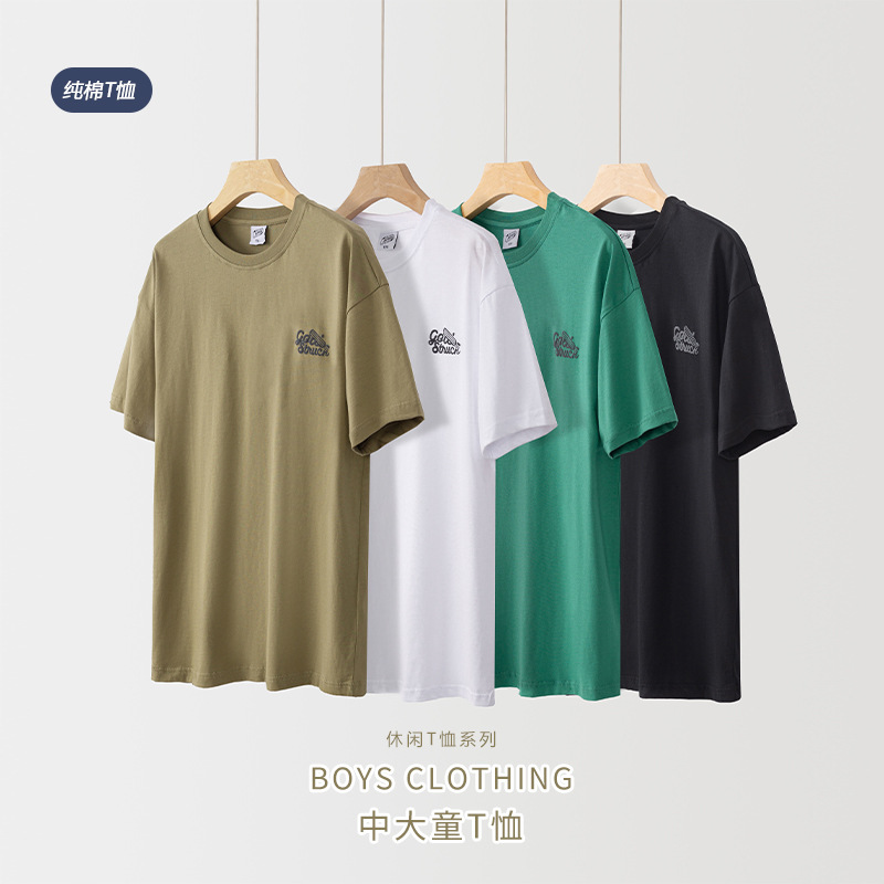 | nameOriginal | 2024 new fashion brand four-color foam printed medium and large boys' T-shirt loose casual reinforced collar cotton top for boys |