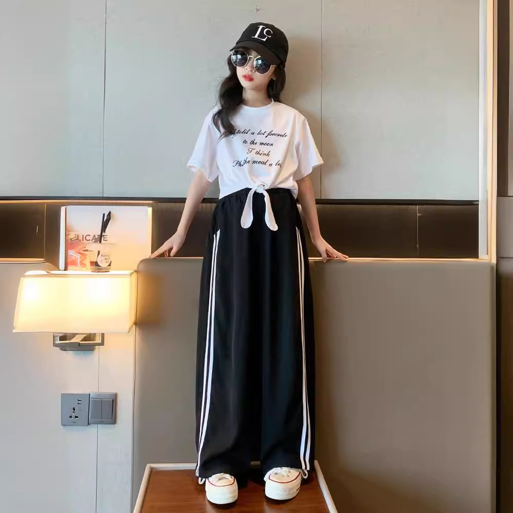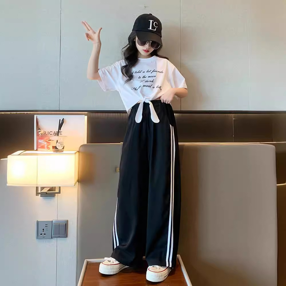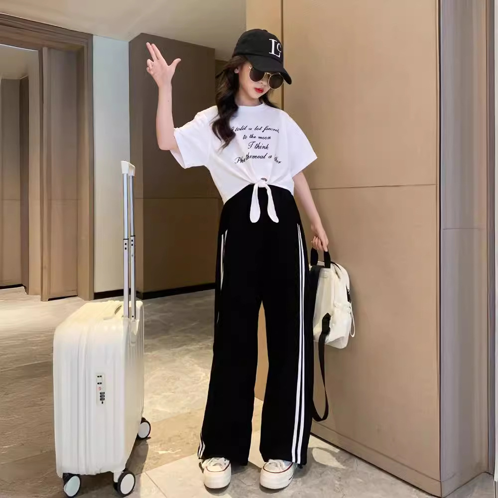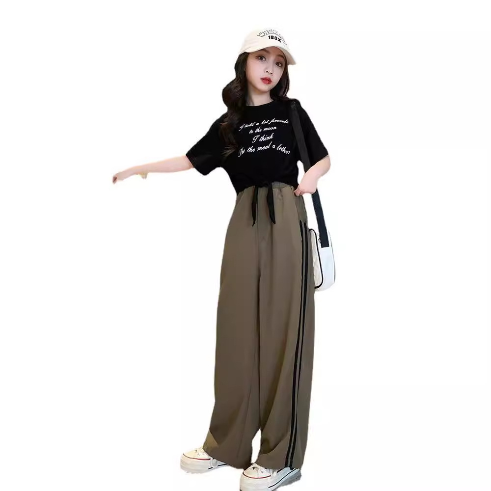 2024 New Girls' Summer Suit Western-style Internet-famous Summer Girls' Big Boy Street-fried Casual Wide-leg Pants Two-piece Fashionable Set