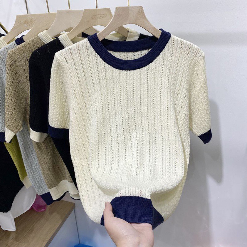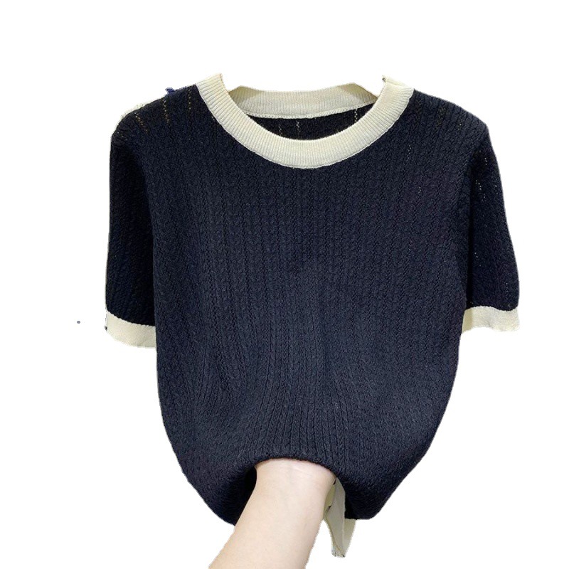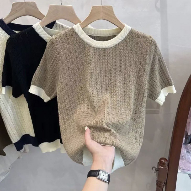 2024 New Ice Silk Short-sleeved Shirt Women’s Summer Stitching Hollow Thin Loose plus size Round Neck Top Knitted Sweater