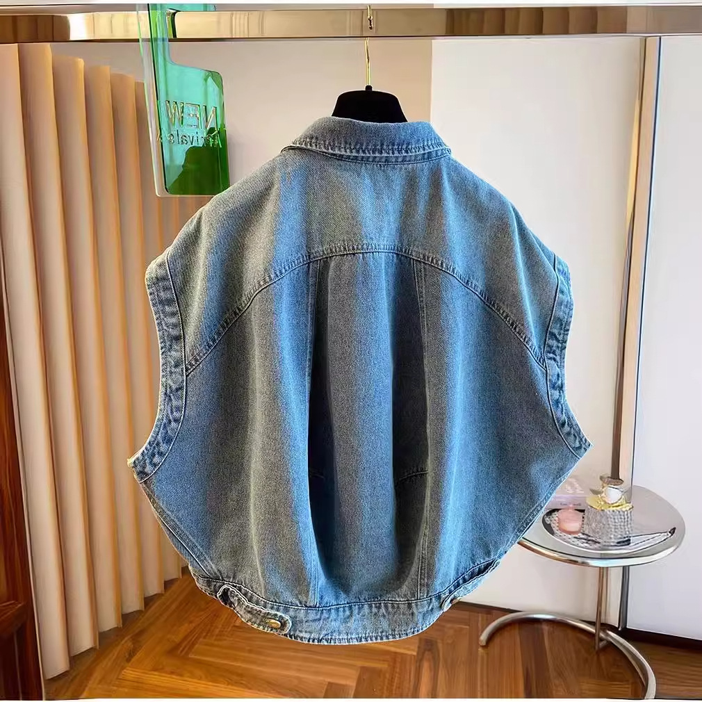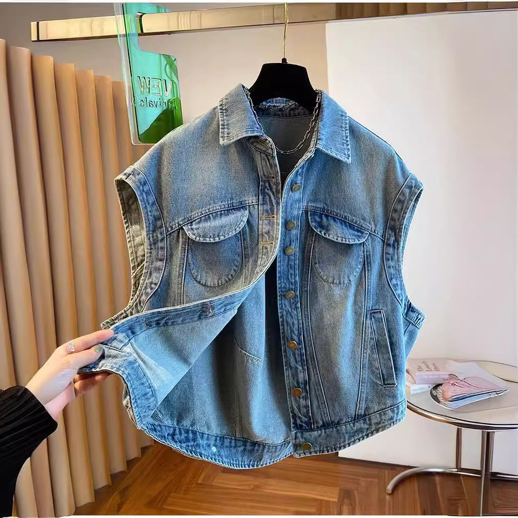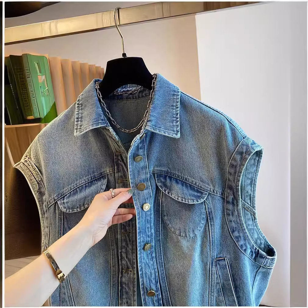 2024 New Korean Style Loose Design Sense Denim Vest Women's Spring and Autumn European Outfit Sleeveless Winch Vest Jacket