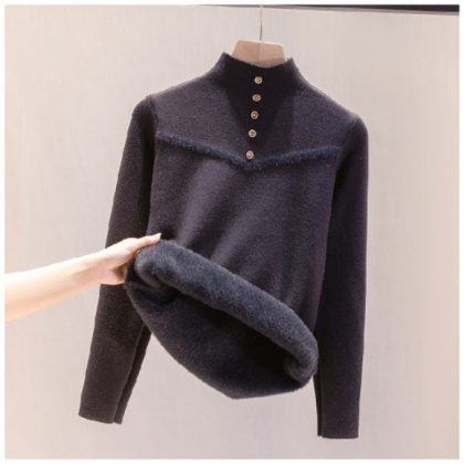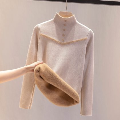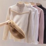 2024 new long sleeve pullover warm one-piece velvet half turtleneck fleece-lined knitted bottoming shirt inner top women’s fashion