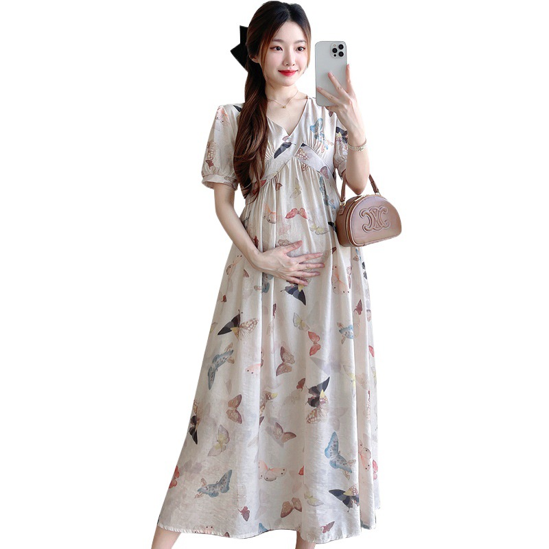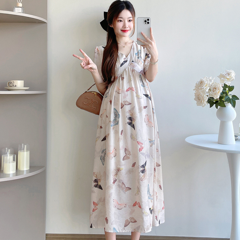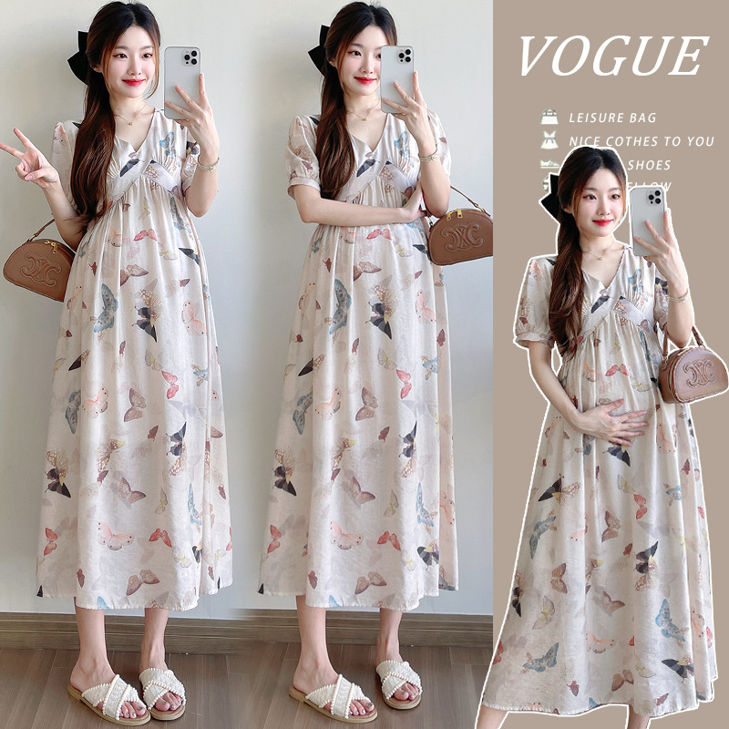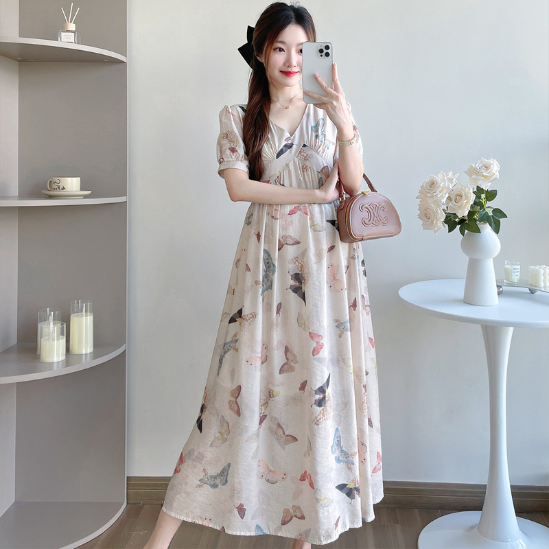 | nameOriginal | 2024 new maternity dress with butterfly flower loose V-neck lantern sleeves western style pregnant women dress |