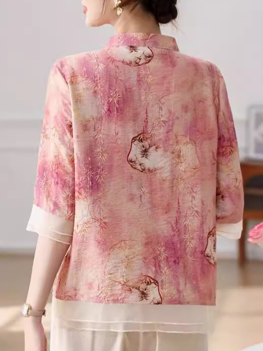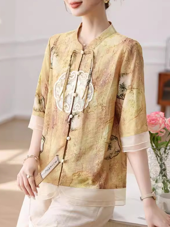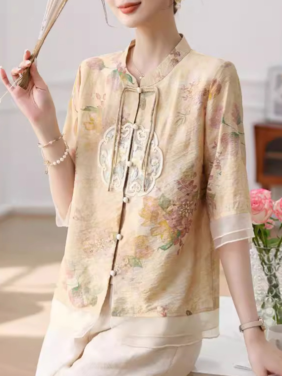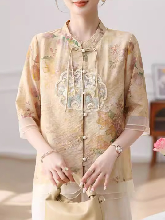 | nameOriginal | 2024 new mother's summer national style small shirt suit middle-aged and elderly women's western style grandma half sleeve chiffon shirt |