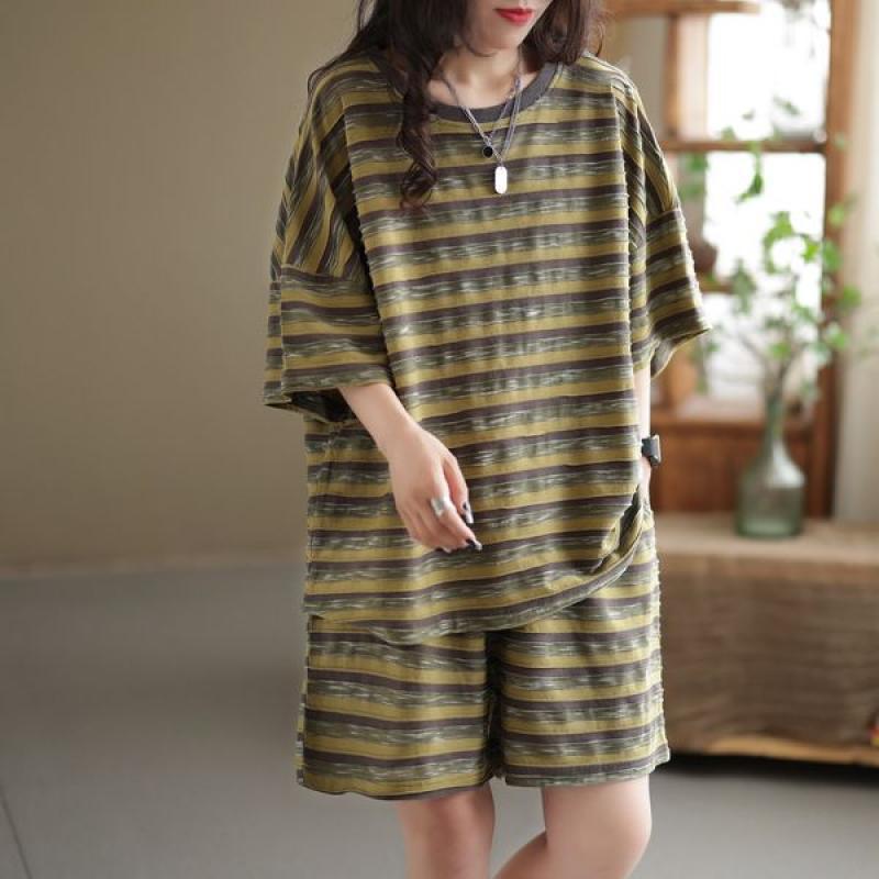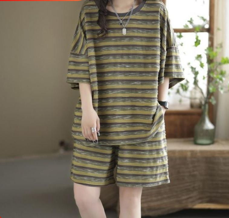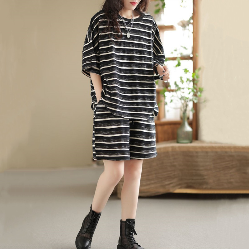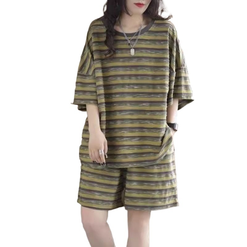 2024 New plus size Summer Fashion Striped Short-sleeved T-shirt Shorts Loose Meat Covering Casual Two-piece Suit for Women
