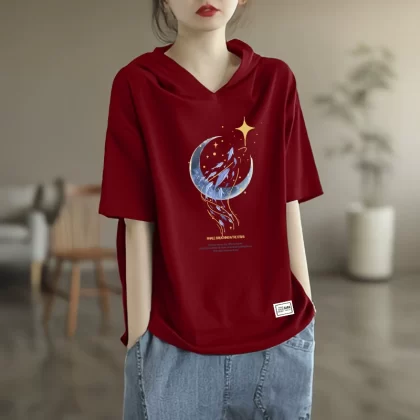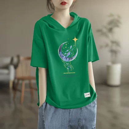 | nameOriginal | 2024 new pure cotton hooded short-sleeved T-shirt women's summer wear loose large size flesh-covering slim design right shoulder top |