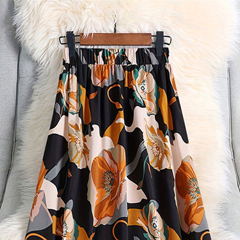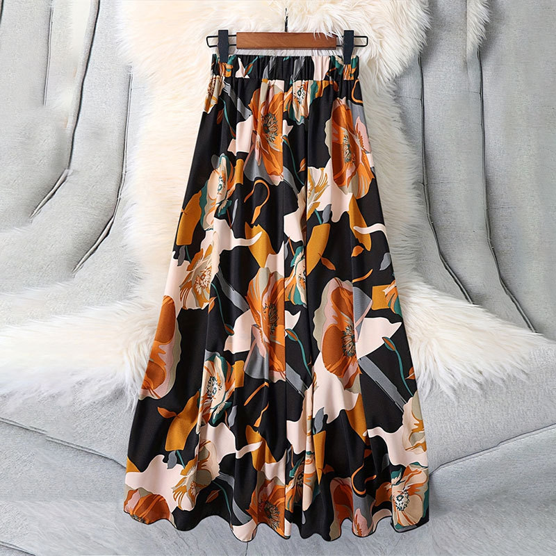 2024 new spring and summer micro-transparent elastic waist printed long skirt commuter all-match A- swing skirt umbrella skirt women’s clothing