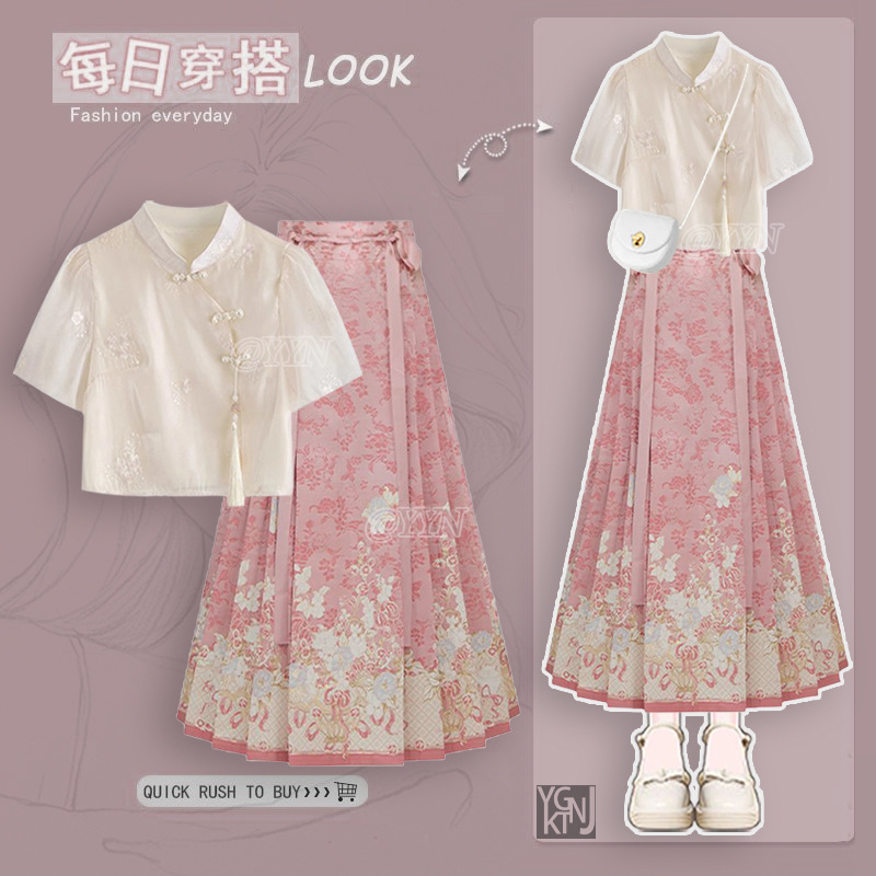| nameOriginal | 2024 New Style Hanfu Dress Western Style Short Sleeve New Chinese Style Improved Shirt Slimming Pink Horse-faced Skirt Two-piece Set |