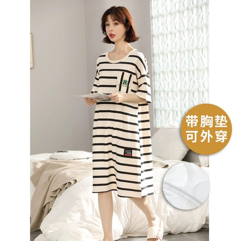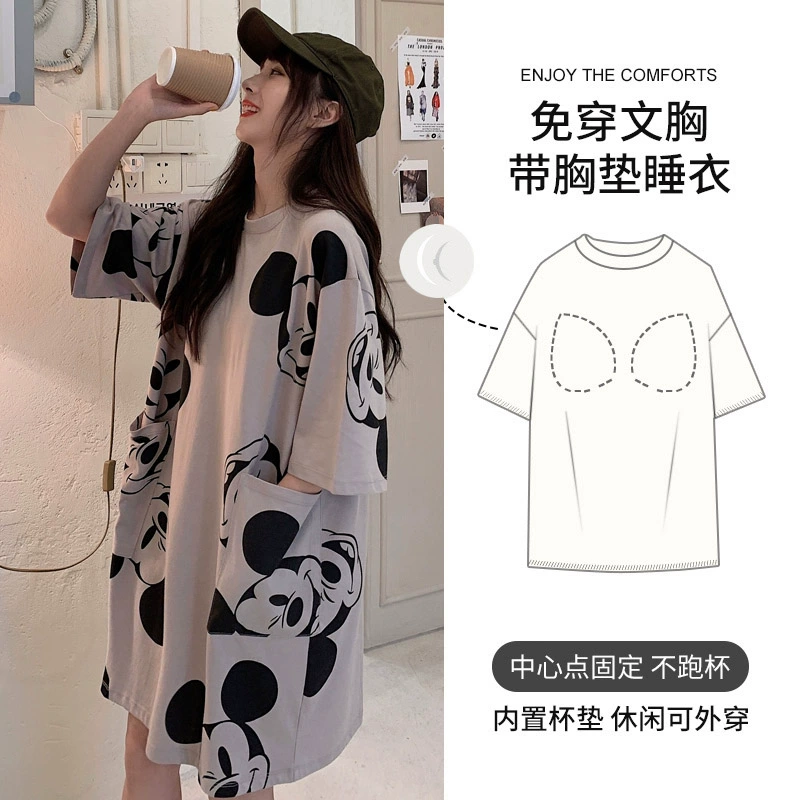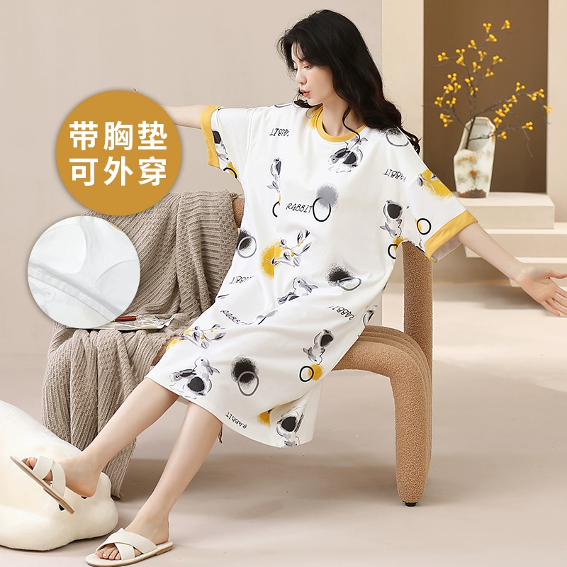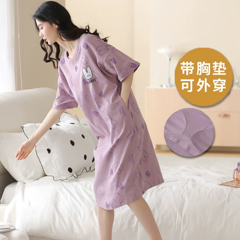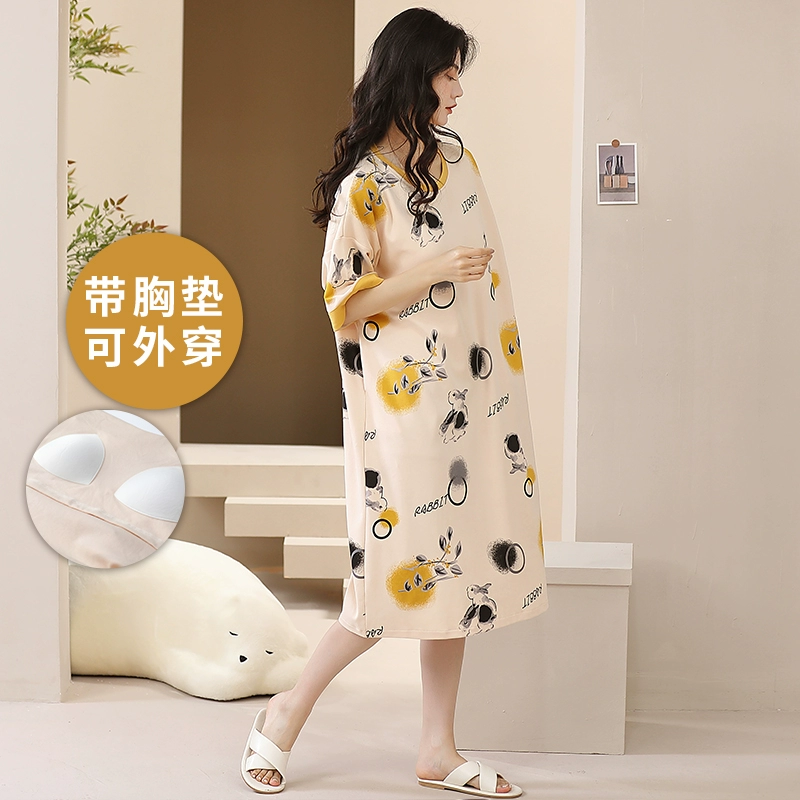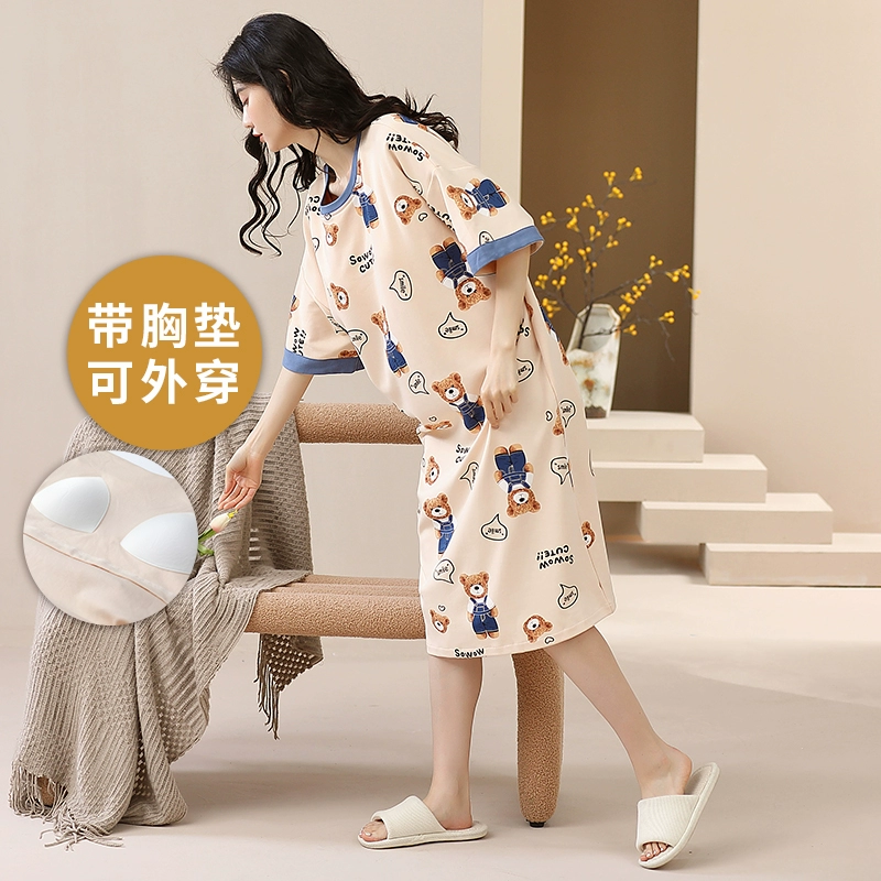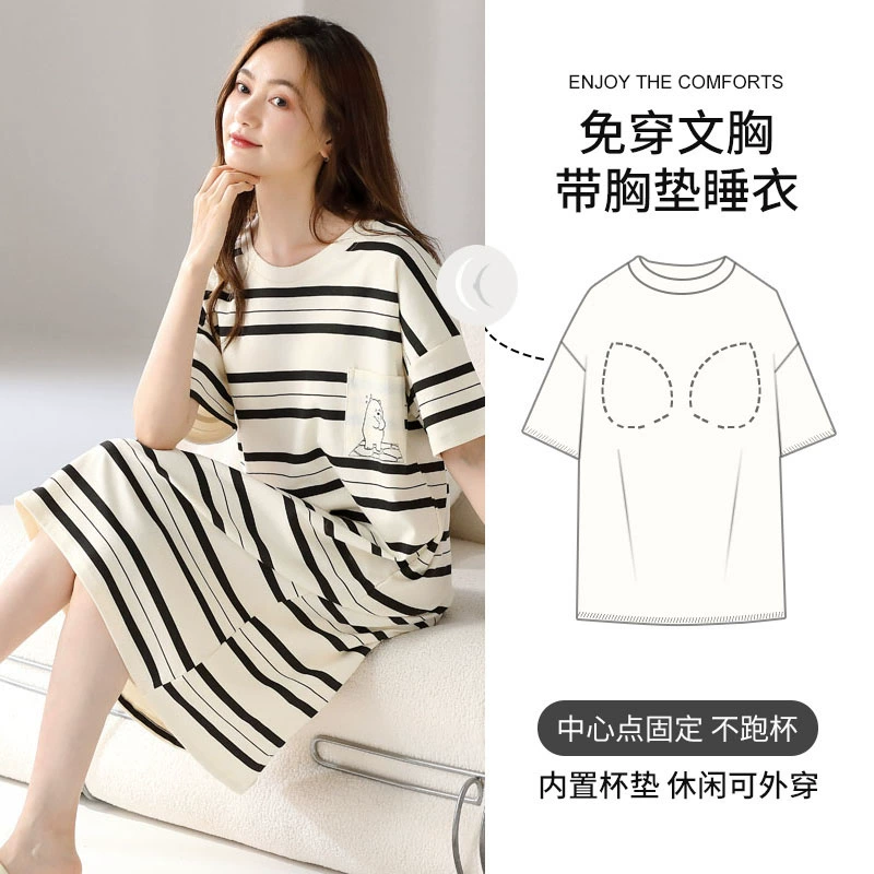 2024 new style nightgown with breast pads for women summer thin pure cotton short-sleeved pajamas all in one spring and summer Korean style sweet cat