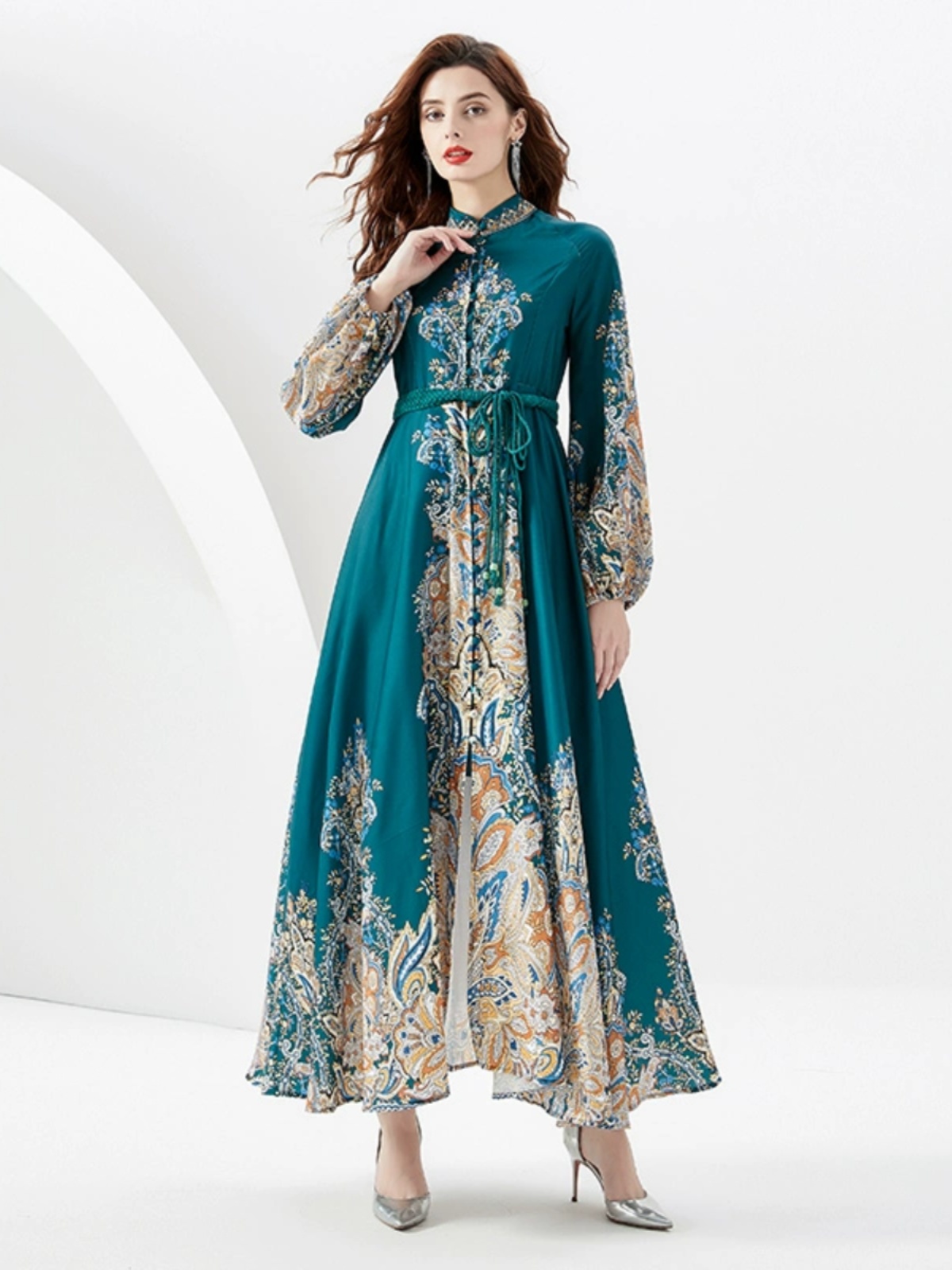 | nameOriginal | 2024 New Style Women's Vacation Style Stand-up Collar Single-breasted Palace Style Retro Print Wide Hem Long Dress |