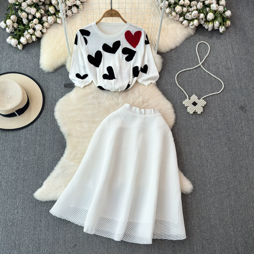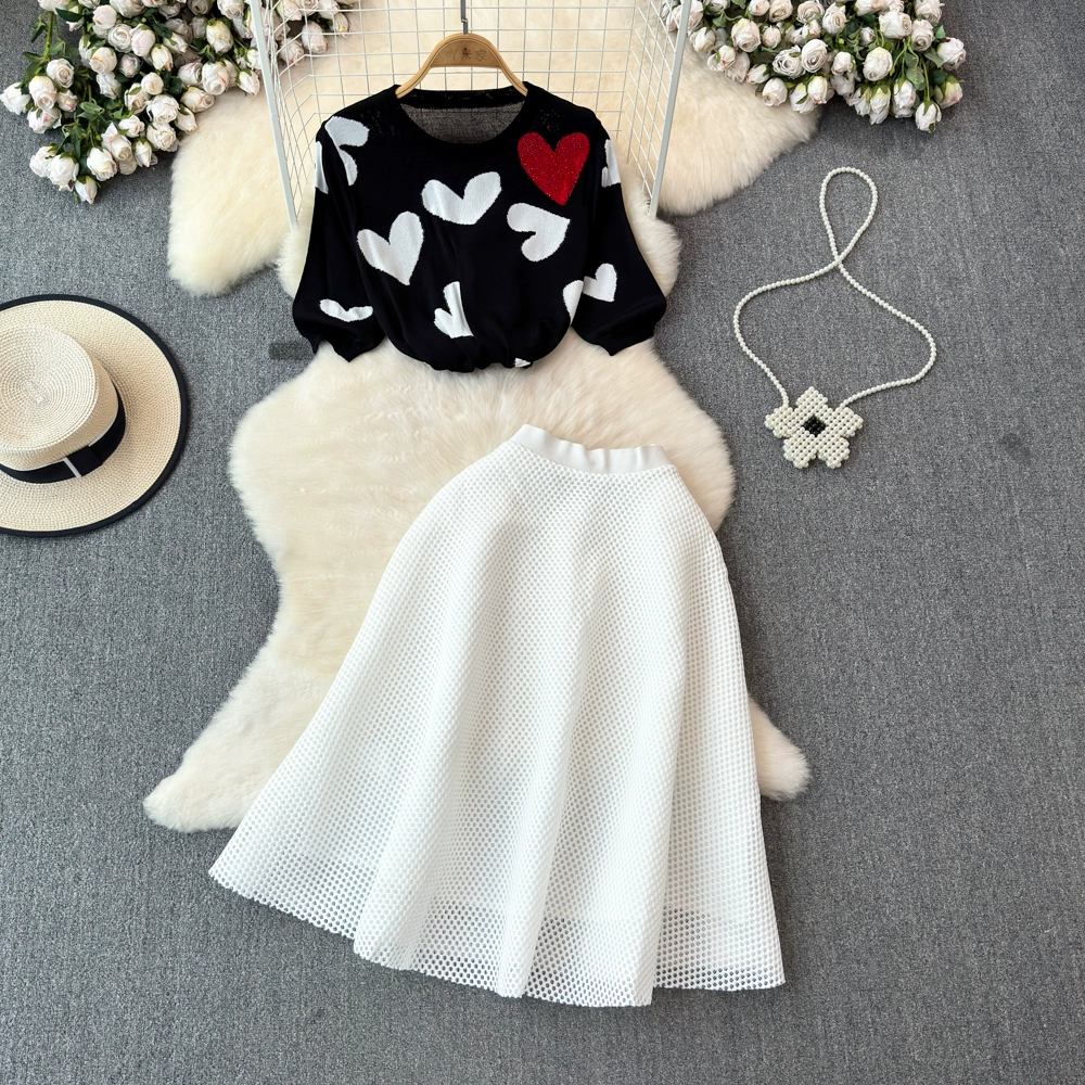| nameOriginal | 2024 new summer clothing design love print loose age-reducing knitted top high-waist mesh skirt suit |