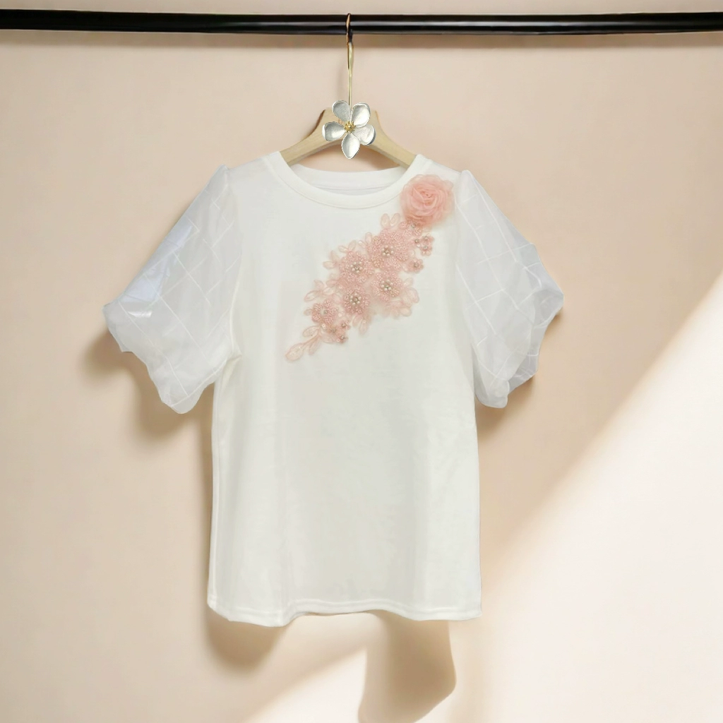 | nameOriginal | 2024 new summer fashion versatile short-sleeved T-shirt women's tops heavy industry flower decoration casual commuting puff sleeves |