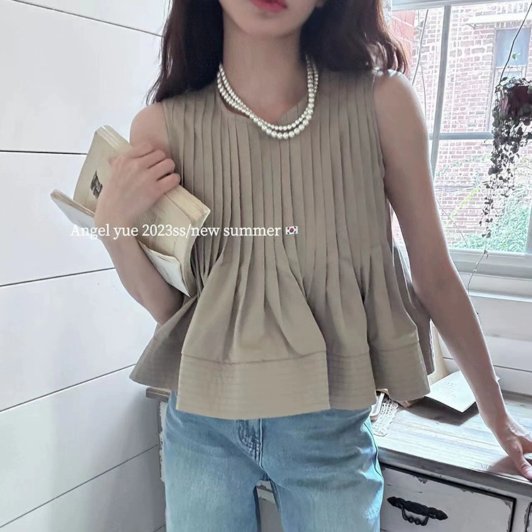 2024 Summer new Korean version of sleeveless sweet pleated shirts simple wild temperament, age -reducing vest, clue girl tide
