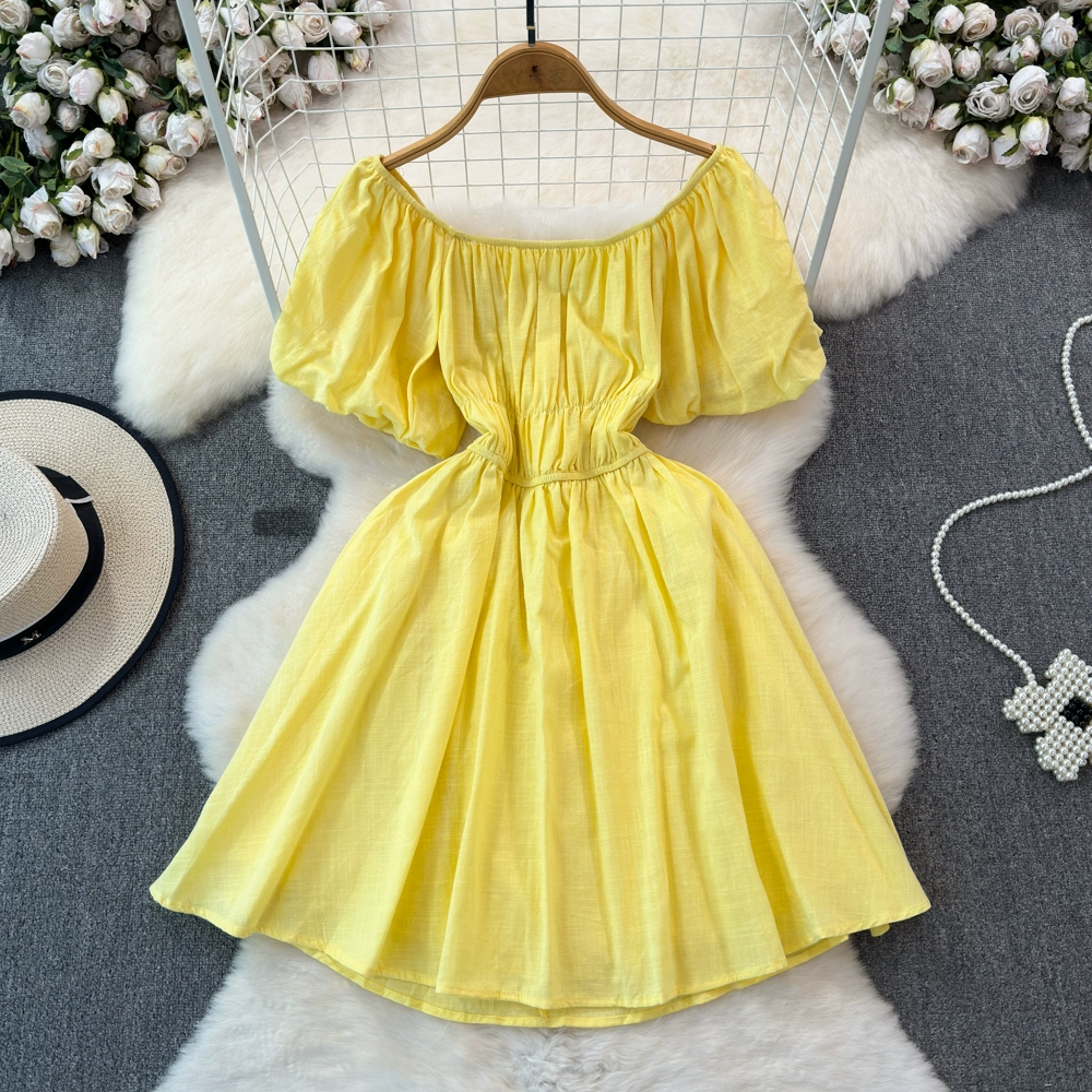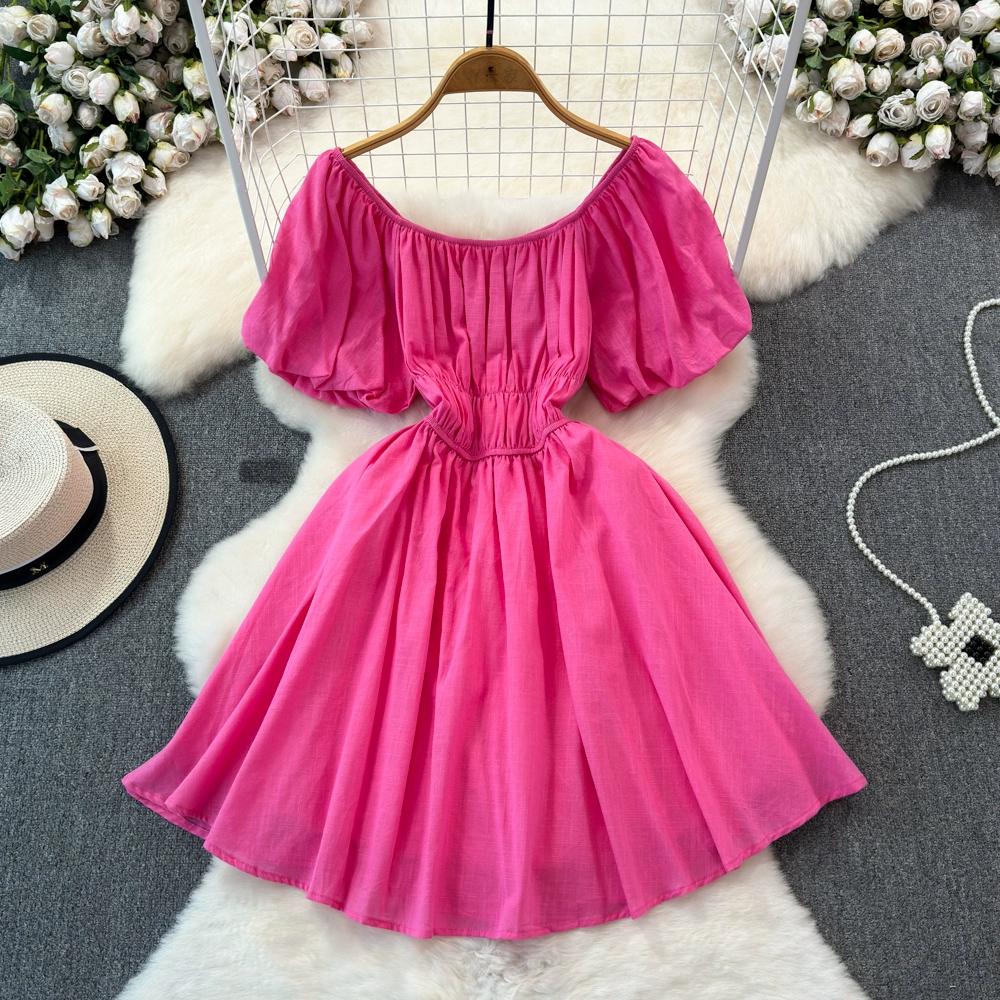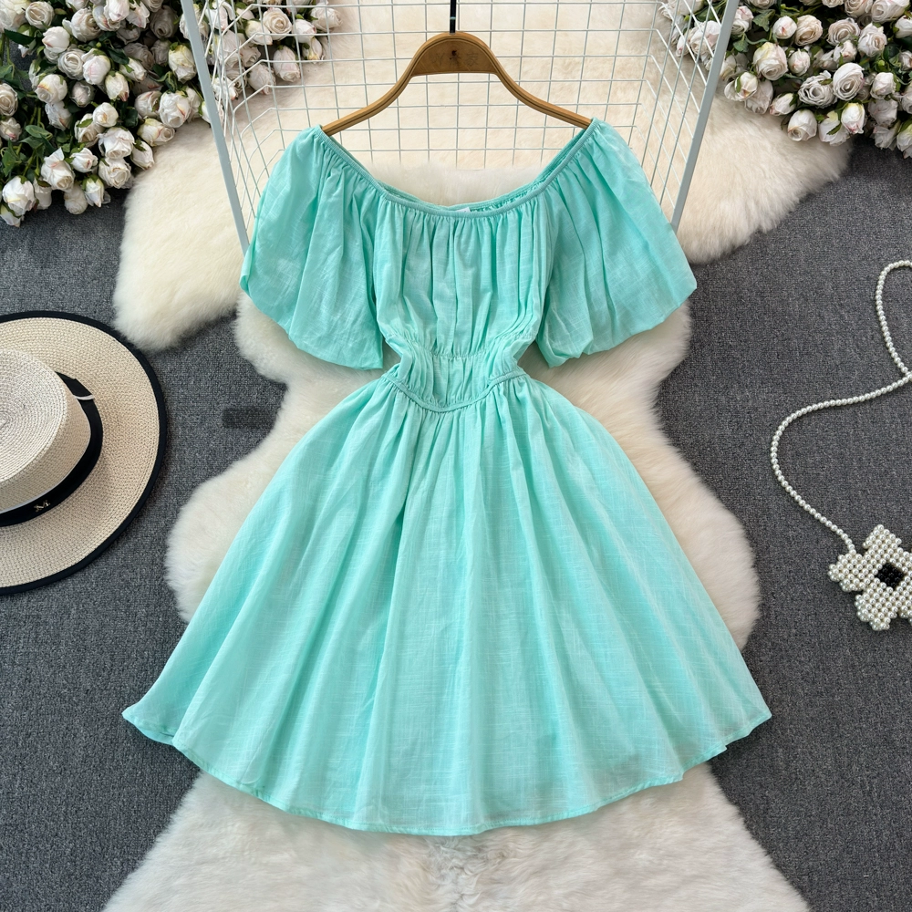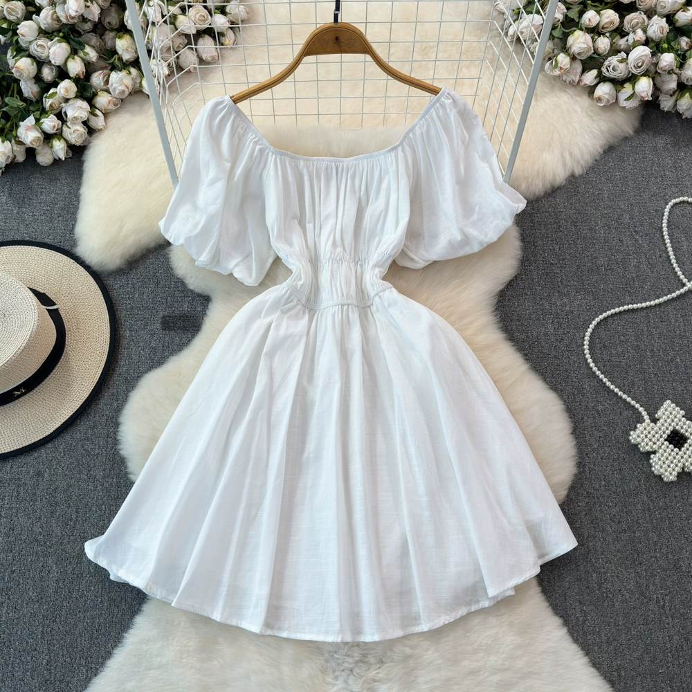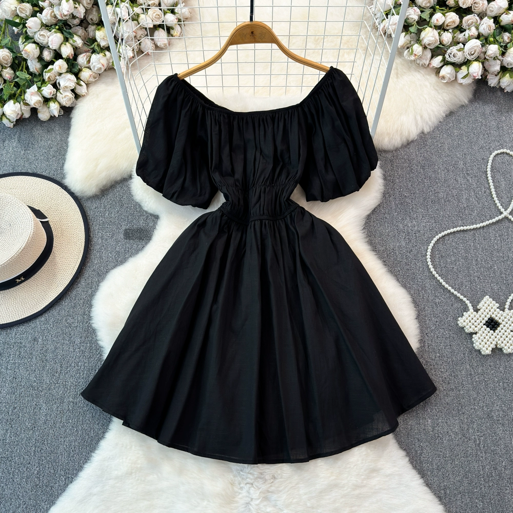 2024 new summer style French one-shoulder off-shoulder pleated waist slimming short a-line dress for women