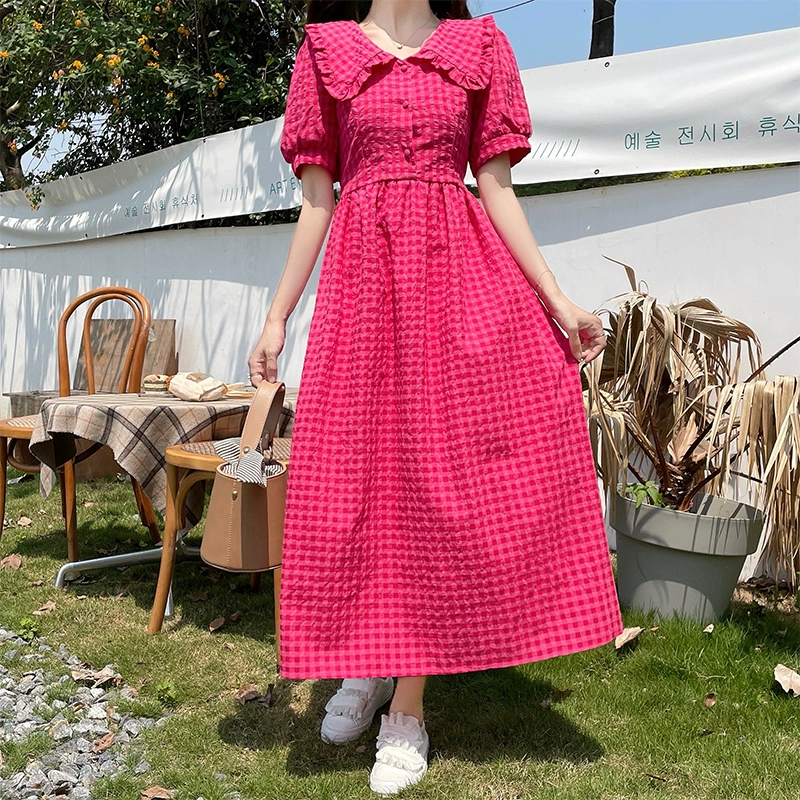 | nameOriginal | 2024 new summer women's design niche sweet puff sleeve doll collar rose red plaid dress |