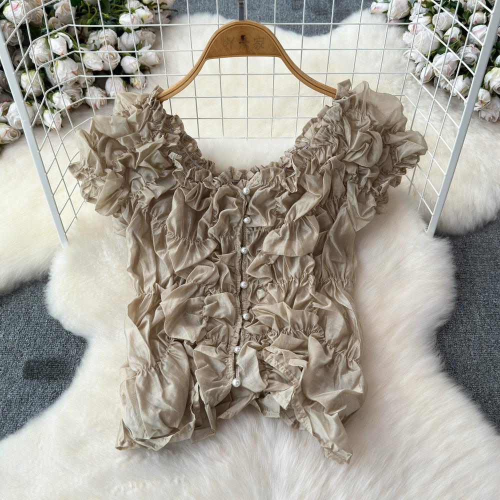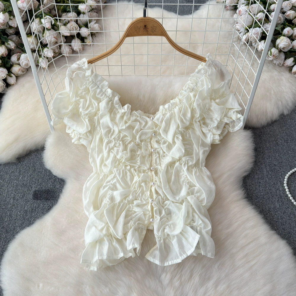 2024 new summer women's pleated ruffled v-neck shirt women's design short chic top