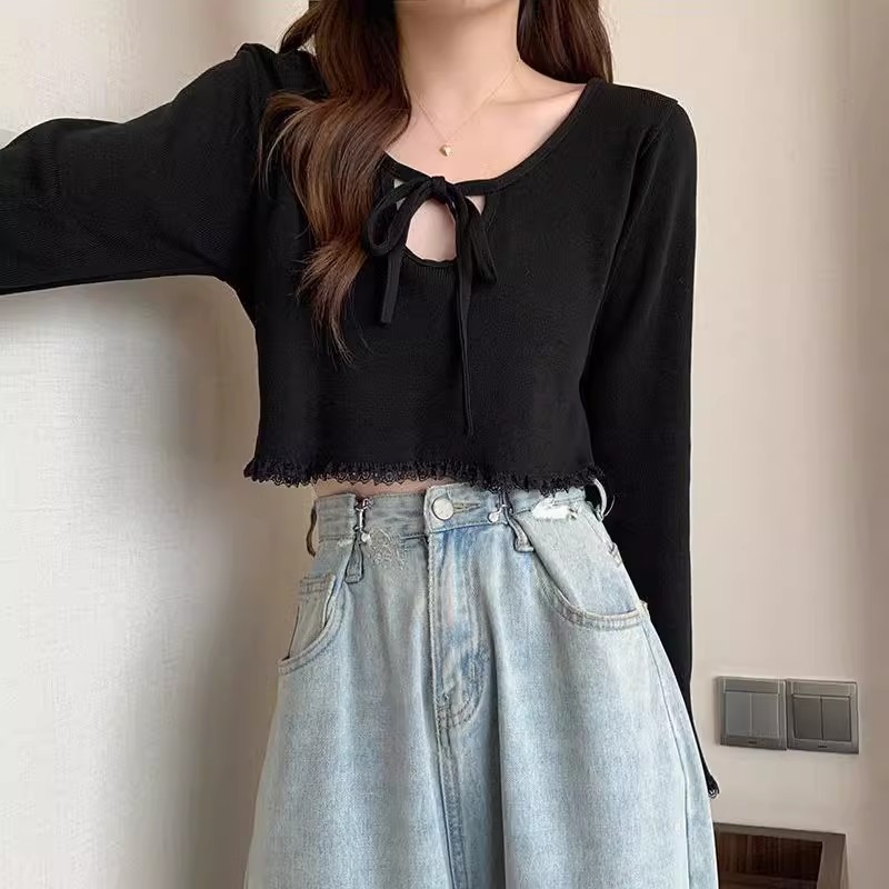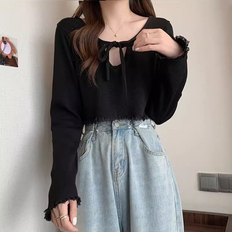 | nameOriginal | 2024 New V-neck Strap Niche Design Short Top Women's White Cropped Long-sleeved Sweater |