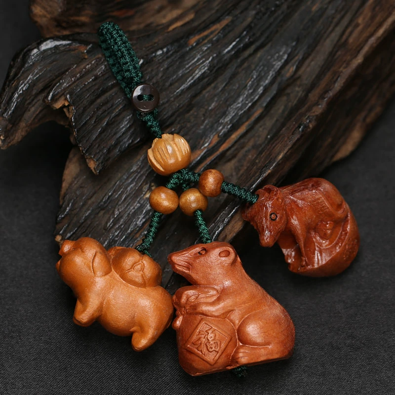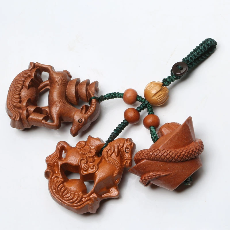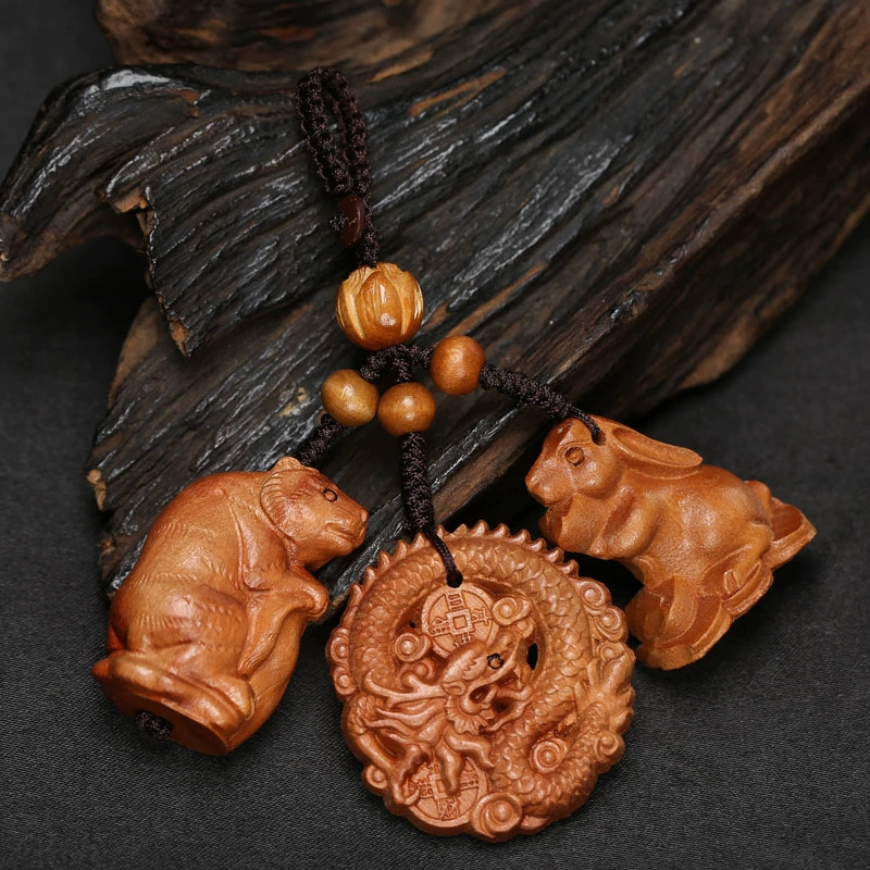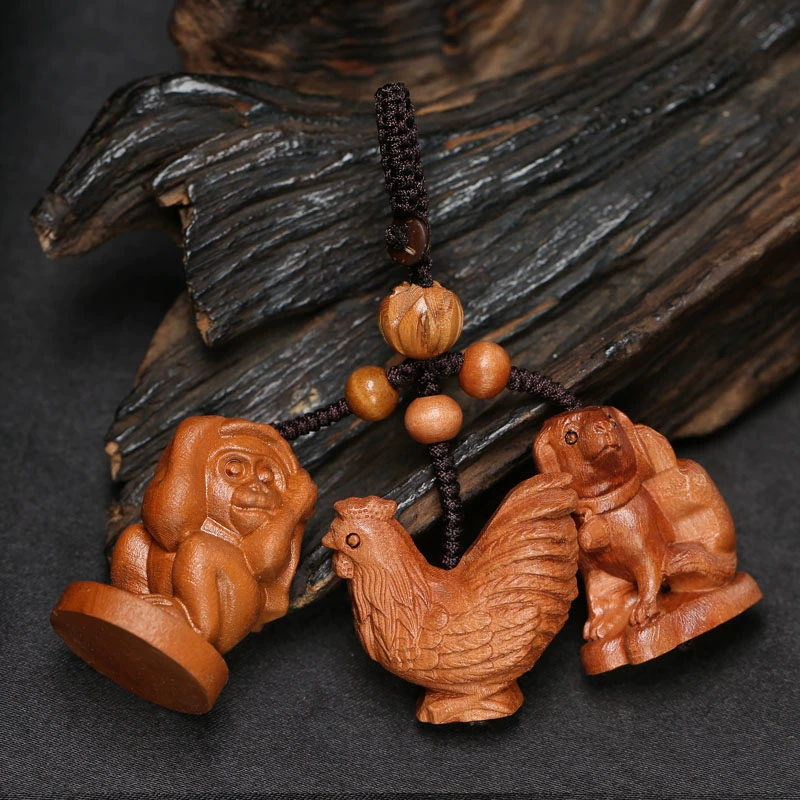 2024 peach wood 12 zodiac signs: rat, ox, tiger, rabbit, dragon, snake, horse, sheep, monkey, chicken, dog, pig, three societies, three-in-one keychain pendant