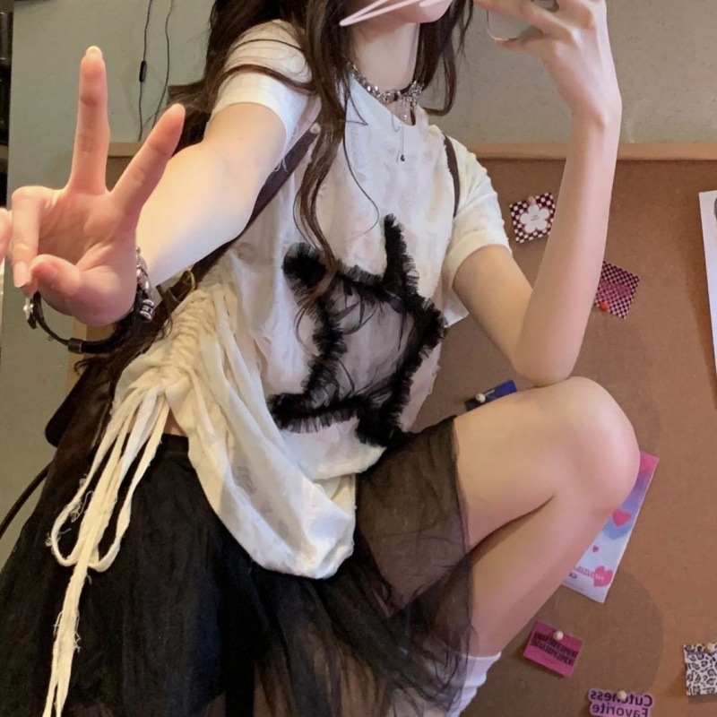 | nameOriginal | 2024 Short Sleeve American Style Hot Girl Design Star T-Shirt Top Mesh Culottes Short Skirt suit Women |