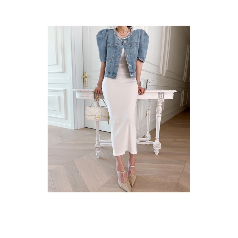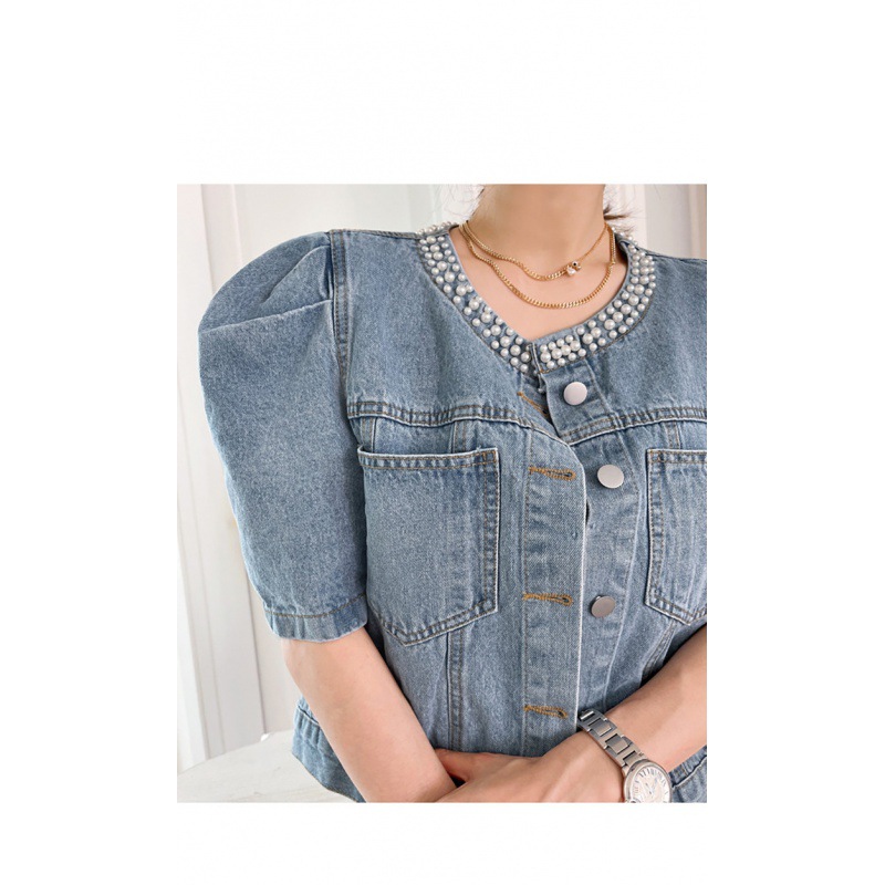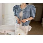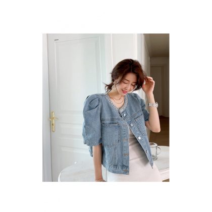 2024 South Korea chic age-reducing short design bubble sleeve beaded short Denim coat for women