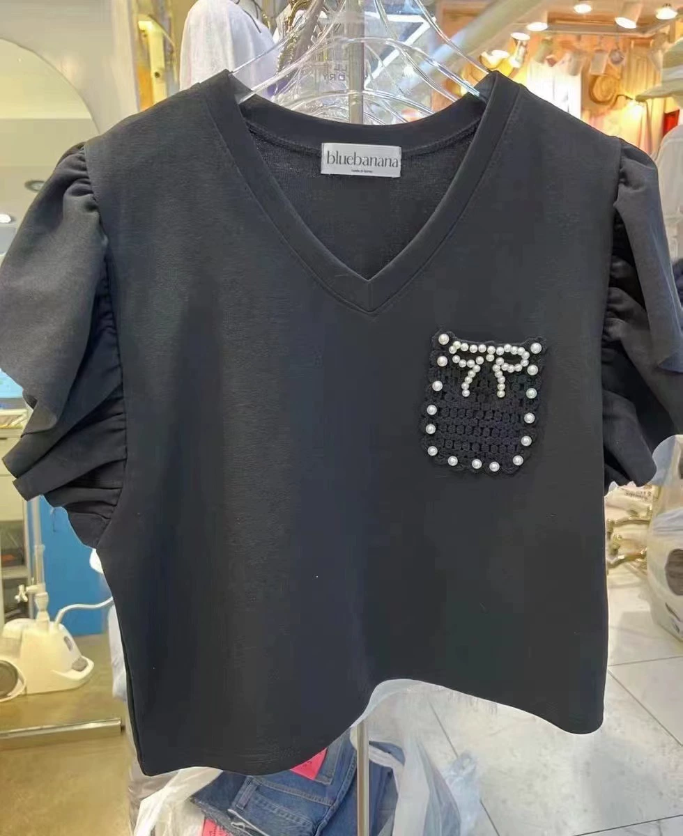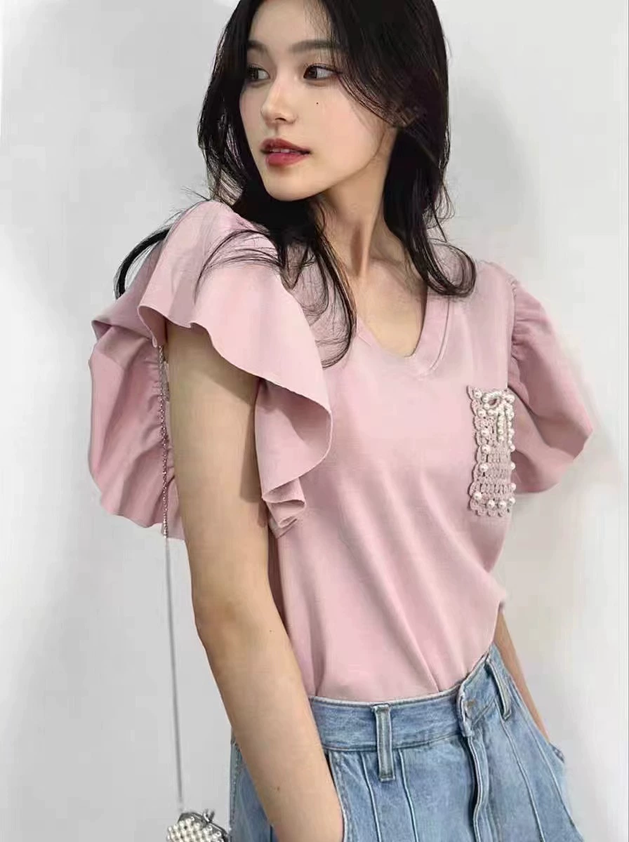 | nameOriginal | 2024 South Korea Dongdaemun Summer Clothing New Women's V-neck Beading Stitching Patch Pocket Comfortable Flying Sleeves Versatile T-shirt for Women |