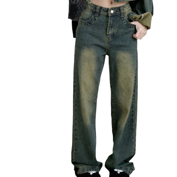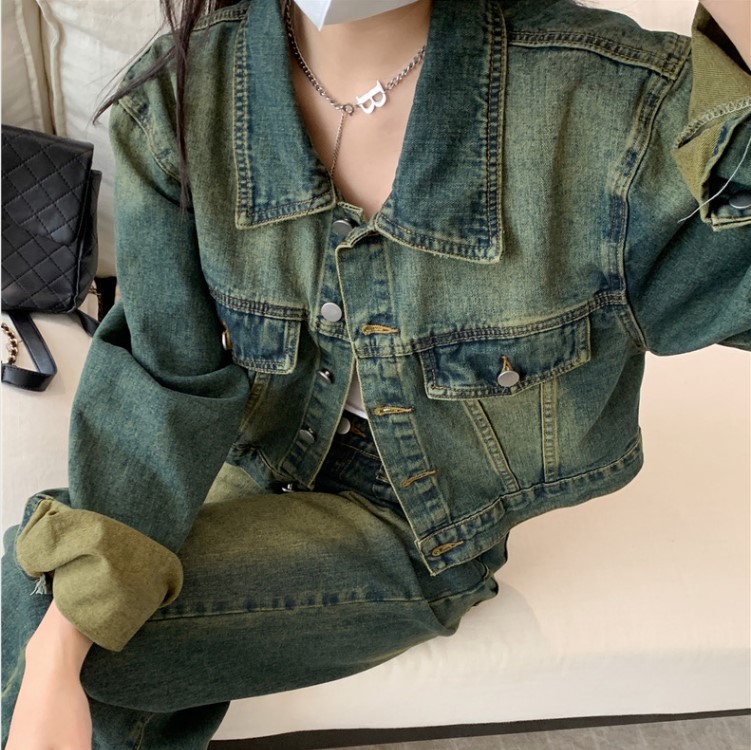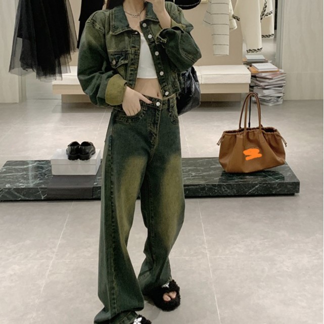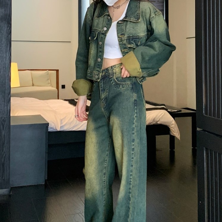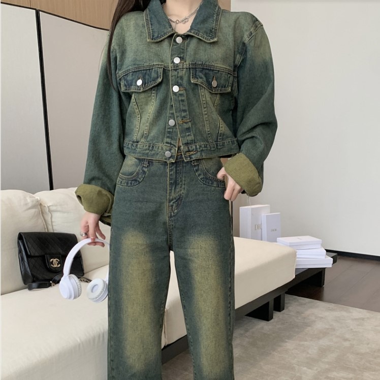 | nameOriginal | 2024 spring and autumn ins classic retro washed distressed Denim coat Top + mop slimming trousers suit |