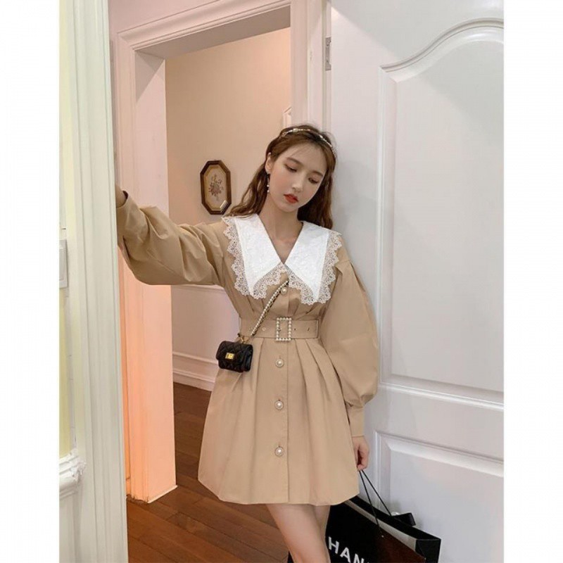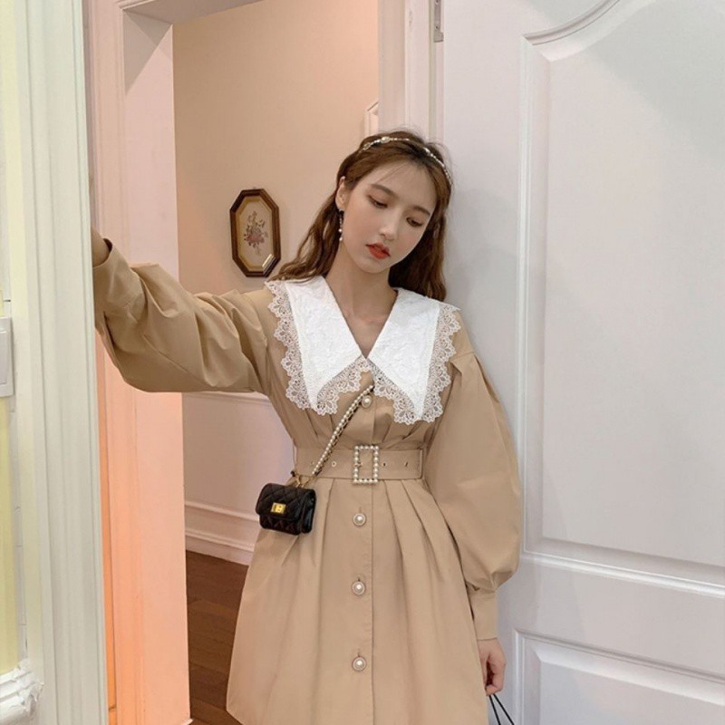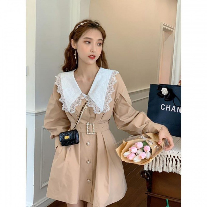 2024 Spring and Autumn New Coat dress French khaki Doll Collar Lace Long Sleeve Waisted Mid-length Coat for Women