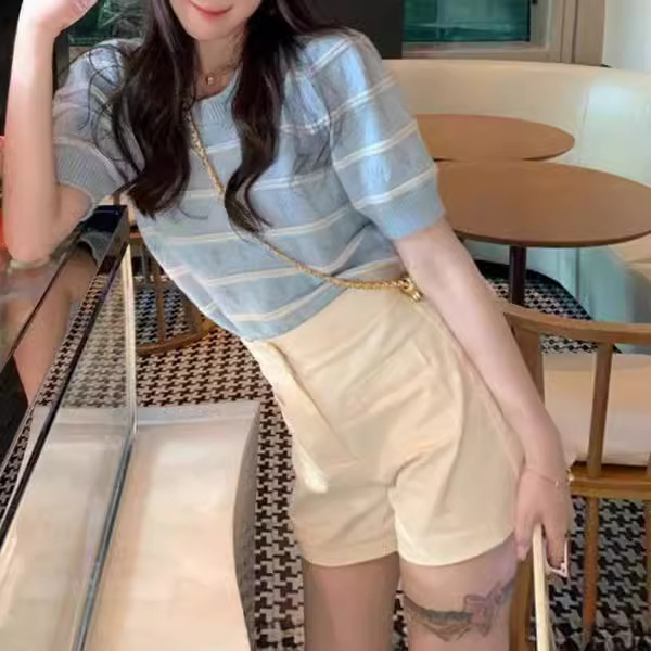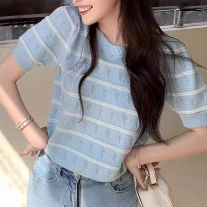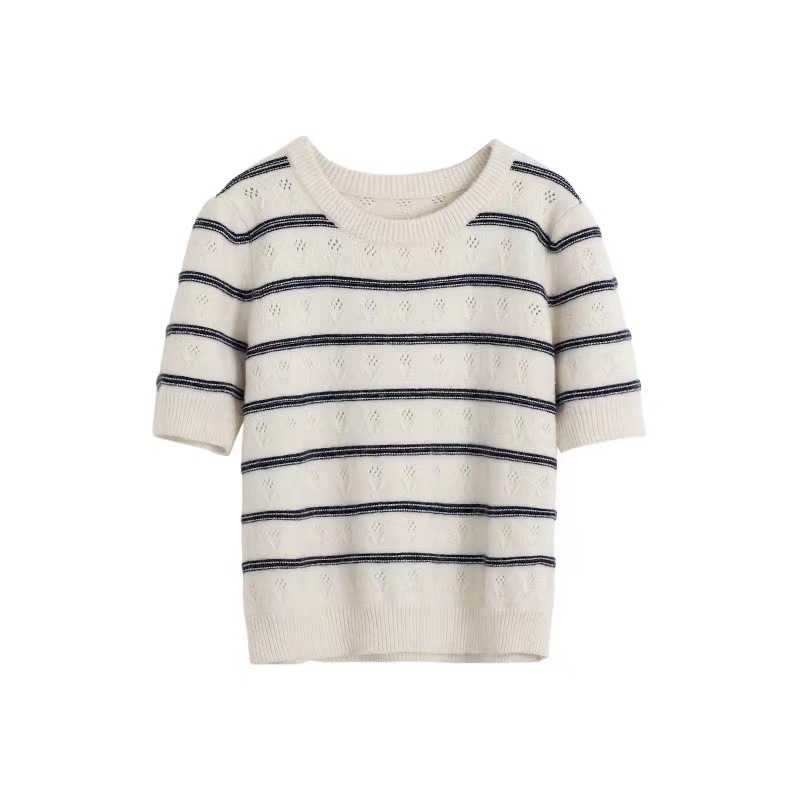| nameOriginal | 2024 Spring and Autumn New Design Niche Striped Short Sleeve Summer Loose Short Top Knitted Shirt |