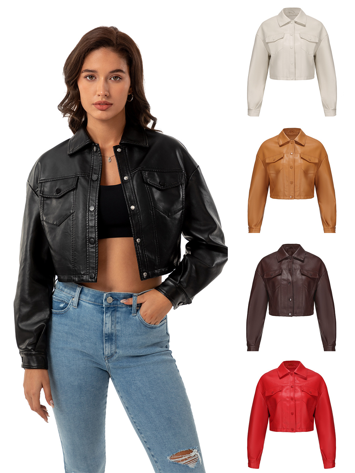 2024 Spring and Autumn New Loose Casual Leather Women's Long-sleeved Single-breasted Women's Short Jacket Lapel European and American Fashion