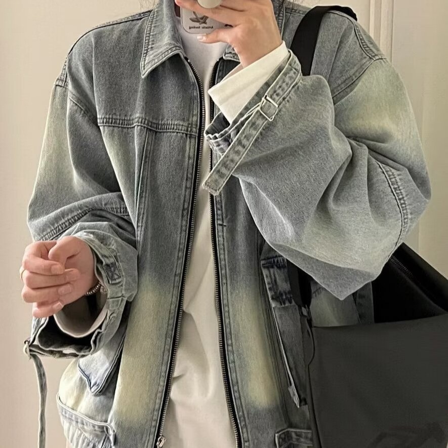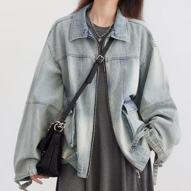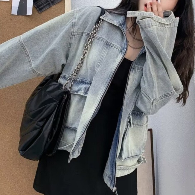 2024 spring and autumn new old washed frock patch bag design solid color long sleeve Denim clip coat casual jacket