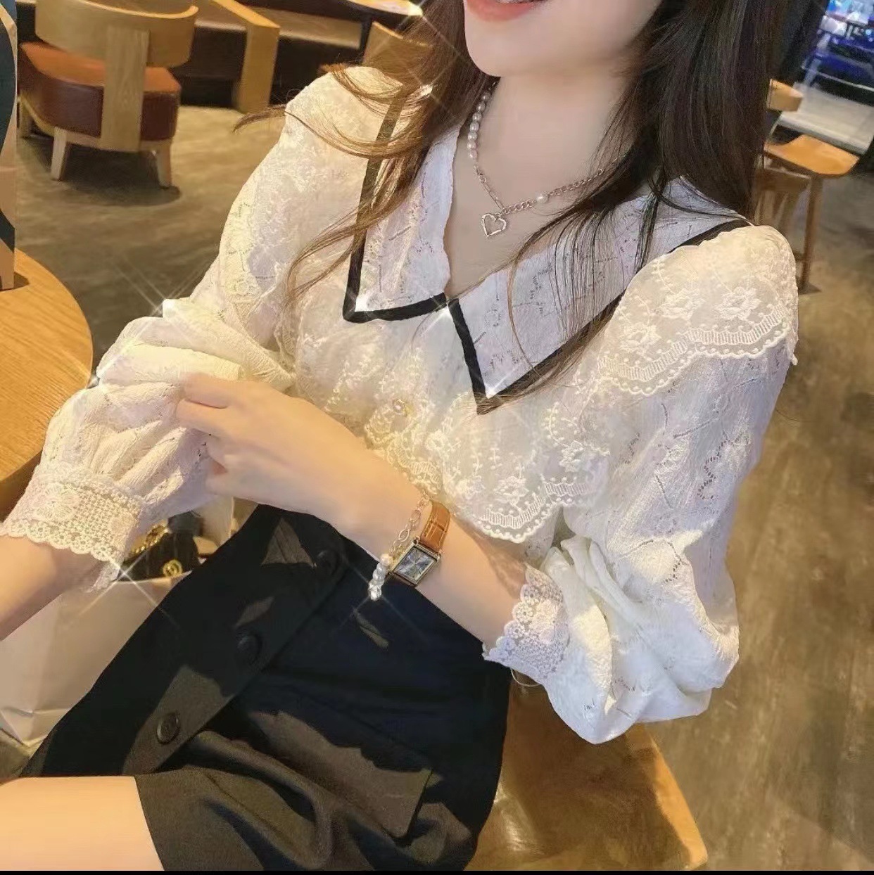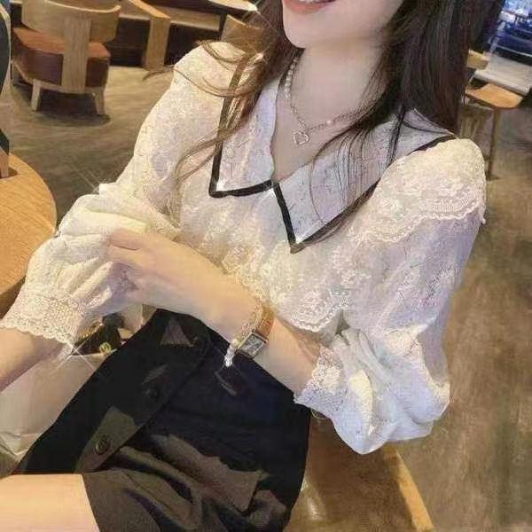 | nameOriginal | 2024 Spring and Summer New Korean Style Contrast Color Doll Collar Lace Stitching Sweet Hollow Crochet Long Sleeve Shirt |