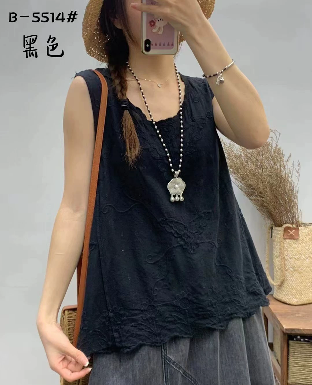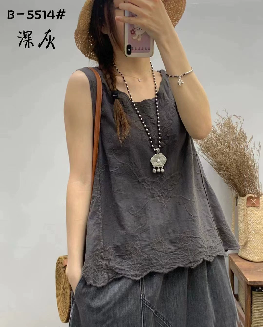 | nameOriginal | 2024 Spring and Summer New Retro Distressed Colored Cotton Embroidered Water Ripple V-neck Pullover Loose Sleeveless Vest for Women |