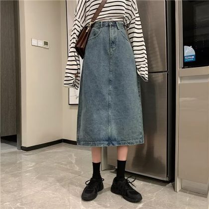 | nameOriginal | 2024 Spring and Summer New Retro Hong Kong Style Denim Skirt Women's Slimming High Waist All-match Split Mid-length A- line Skirt |