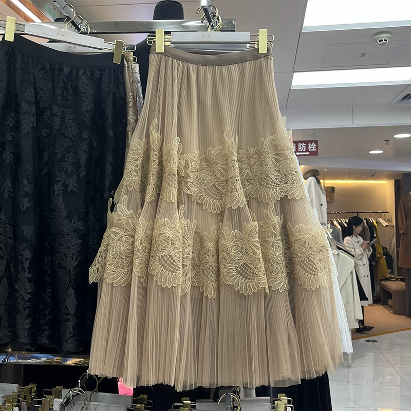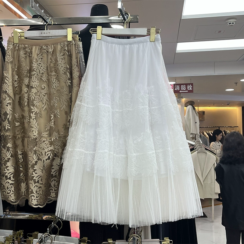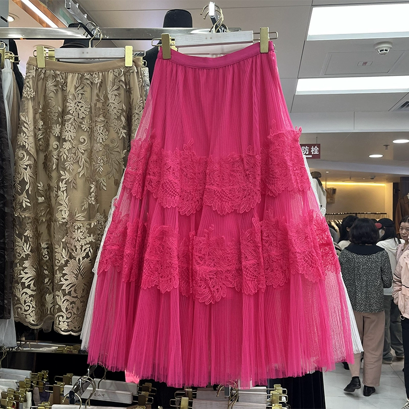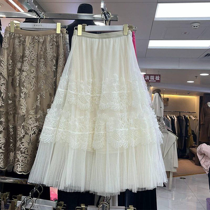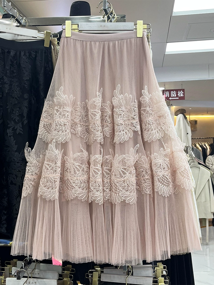 2024 Spring and Summer New Sweet Large Swing Lace Mesh A-Line Skirt Women's High Waist Slim Midi Skirt 663G
