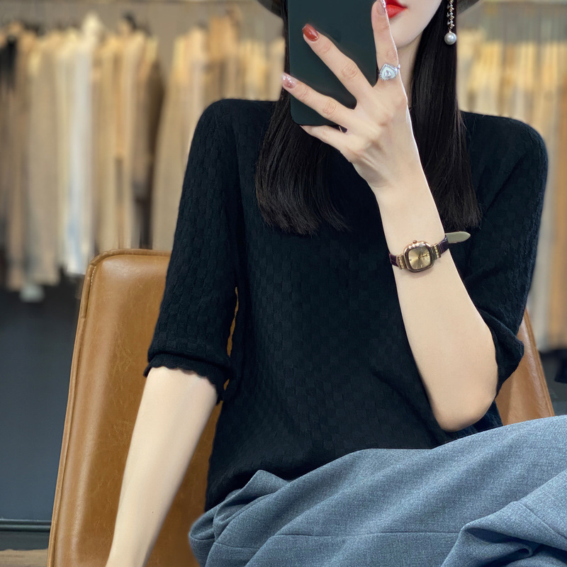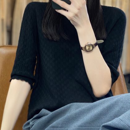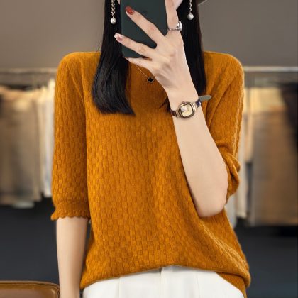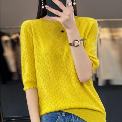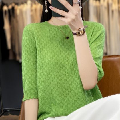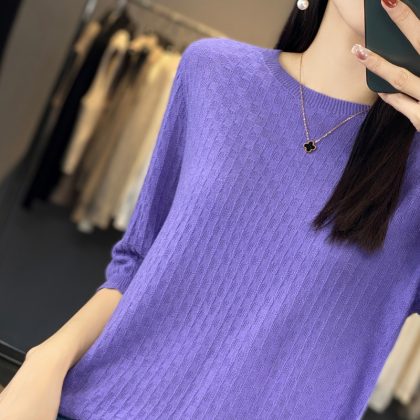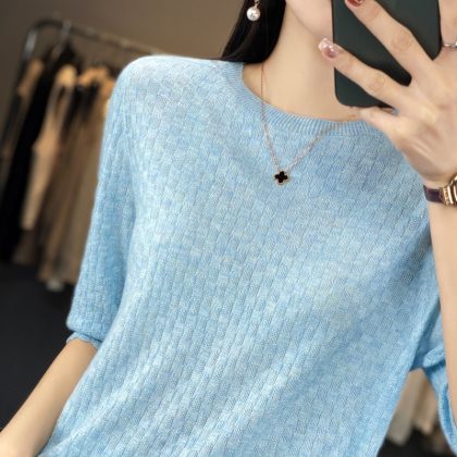 | nameOriginal | 2024 spring and summer thin worsted wool sweater women's half sleeve round neck short sleeve loose bottoming shirt top half sleeve |
