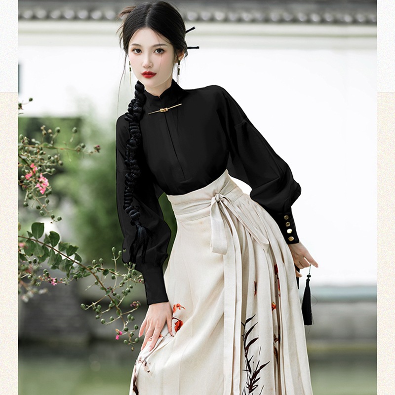 | nameOriginal | 2024 spring new Chinese style retro stand collar long sleeve shirt Chinese style ink printing vest skirt two-piece set |
