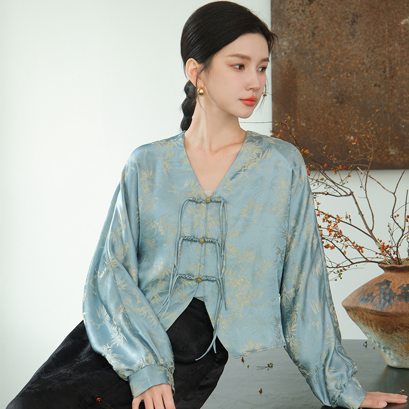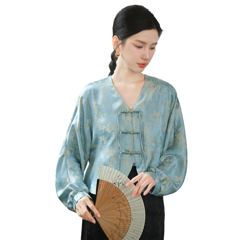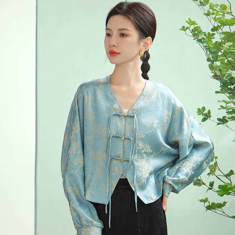 | nameOriginal | 2024 spring new Chinese V-neck woven gold jacquard top handmade buckle coat Zen tea Fu Han clothing Tang suit |