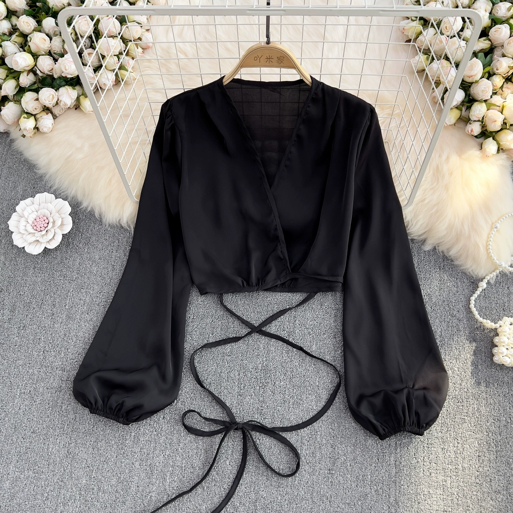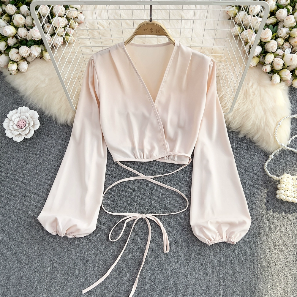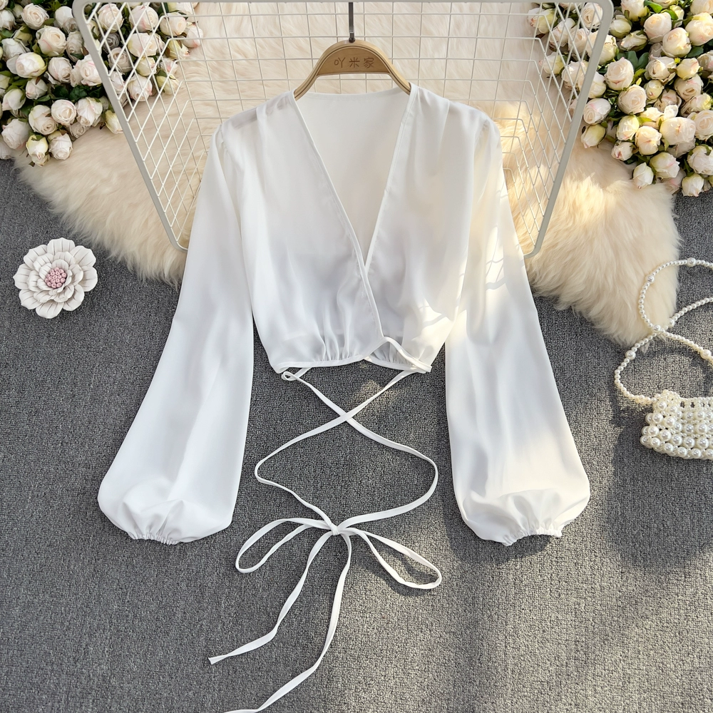 | nameOriginal | 2024 Spring New Korean Style Deep V Neck Puff Sleeve Slim Shirt Women's Fashionable and Chic Short Navel Exposed Top |