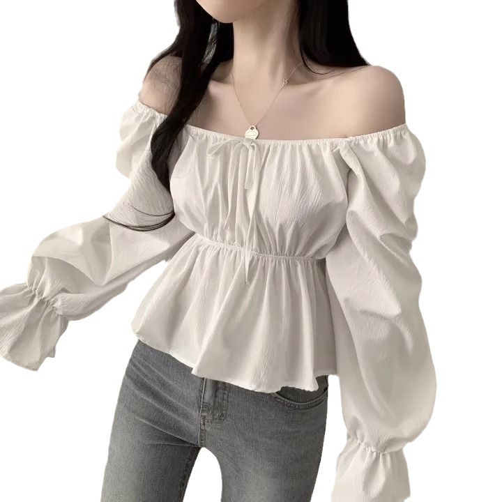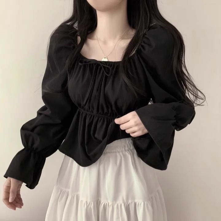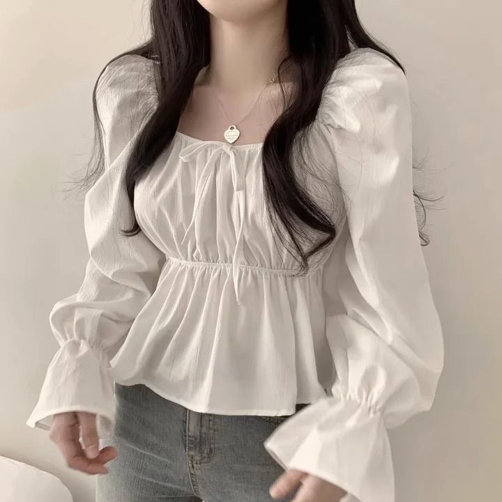 | nameOriginal | 2024 Spring New Korean Style Sweet Square Collar Lace-up Waistline High-end Ruffled Trumpet Sleeve Slim Look Trendy Shirt |