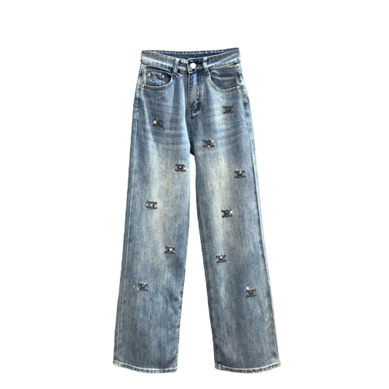 2024 Spring New light blue Letter Embroidery Hot Drilling Denim Trousers Women’s High Waist Loose Slimming Wide Leg Trendy Pants