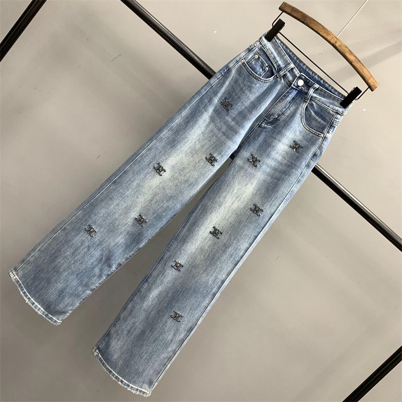 2024 Spring New light blue Letter Embroidery Hot Drilling Denim Trousers Women’s High Waist Loose Slimming Wide Leg Trendy Pants
