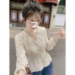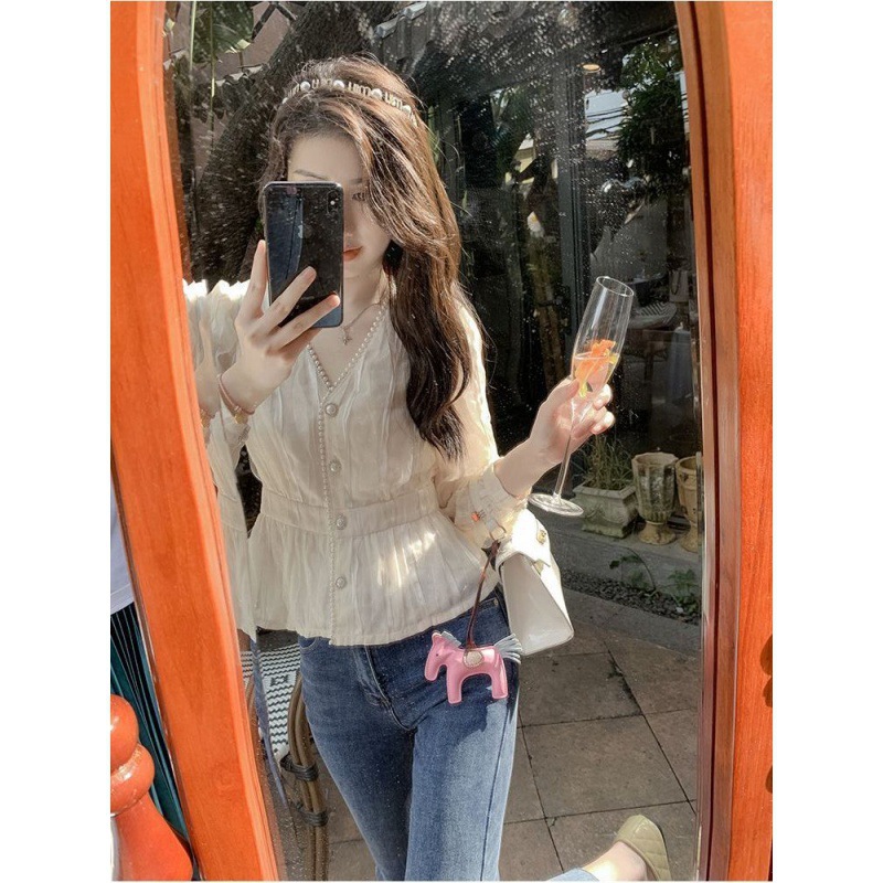 | nameOriginal | 2024 Spring New Niche V-neck Shirt Trendy Western Chiffon Shirt Pearl Tight Waist Slim Inner Top Women |