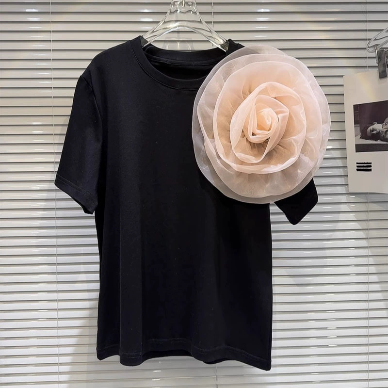 | nameOriginal | 2024 Spring Round Neck Short Sleeve Three-dimensional Large Flower Pin Decoration Loose Designer T-shirt |