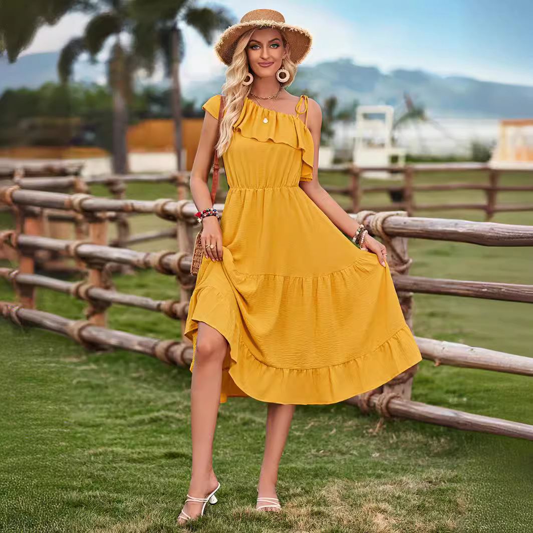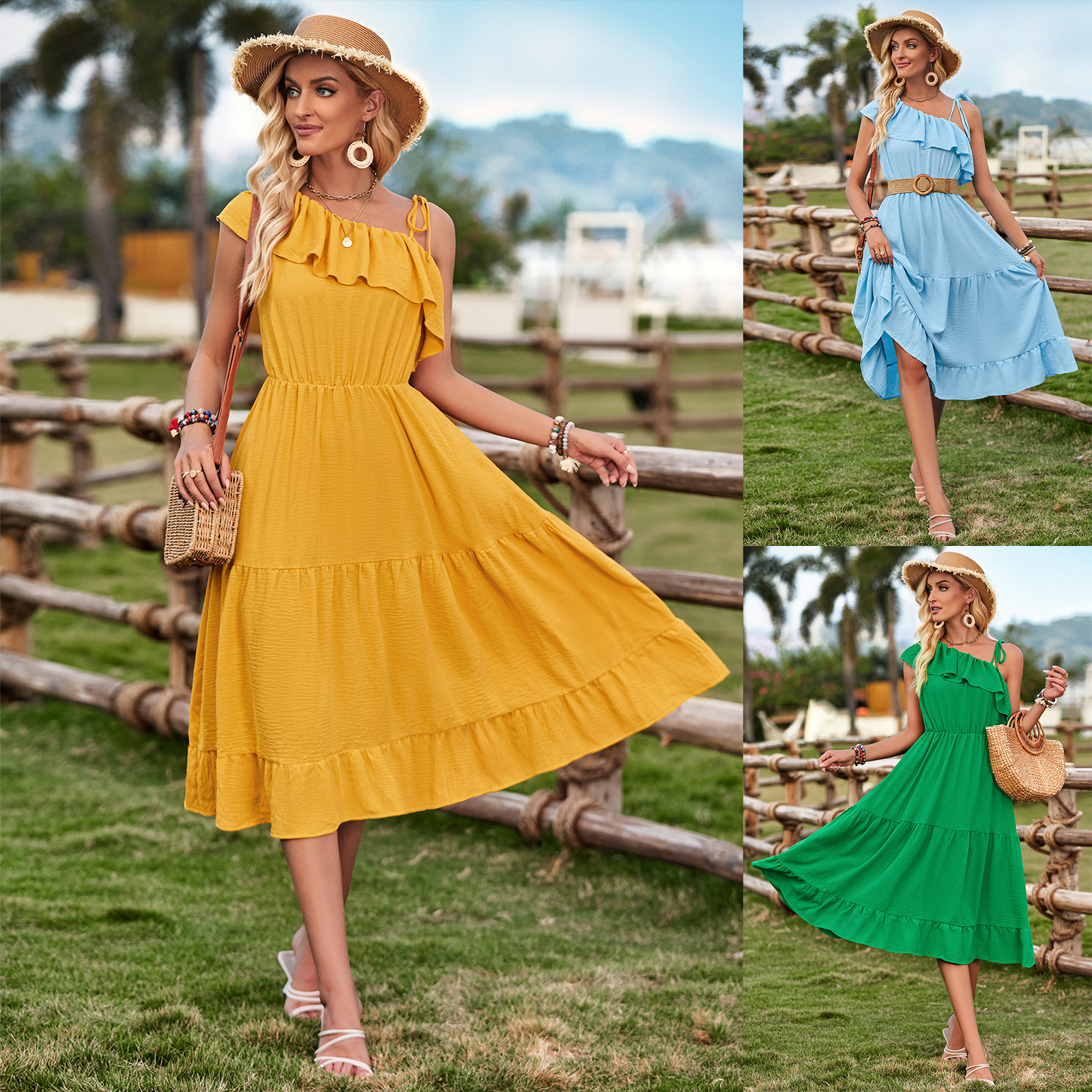 | nameOriginal | 2024 summer casual fresh cross-border women's clothing independent station Foreign Trade single shoulder solid color ruffled waist dress |
