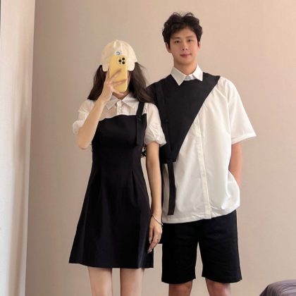 | nameOriginal | 2024 Summer couple's college style color matching A- line short sleeve dress short sleeve men's shirt |