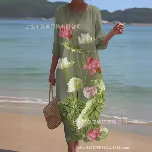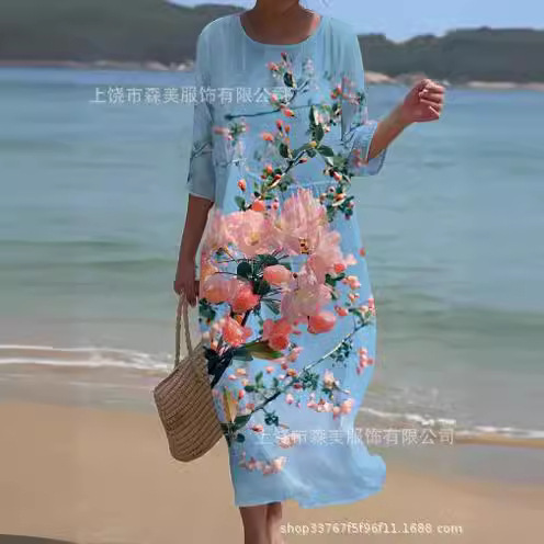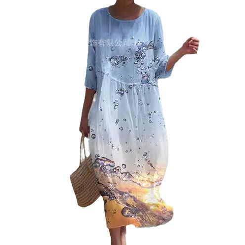2024 Summer Cross-border Amazon European and American Women’s Crewneck Long Printed Casual Fashion Women’s dress Dress