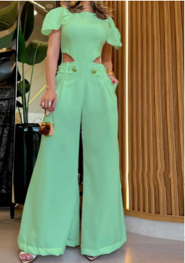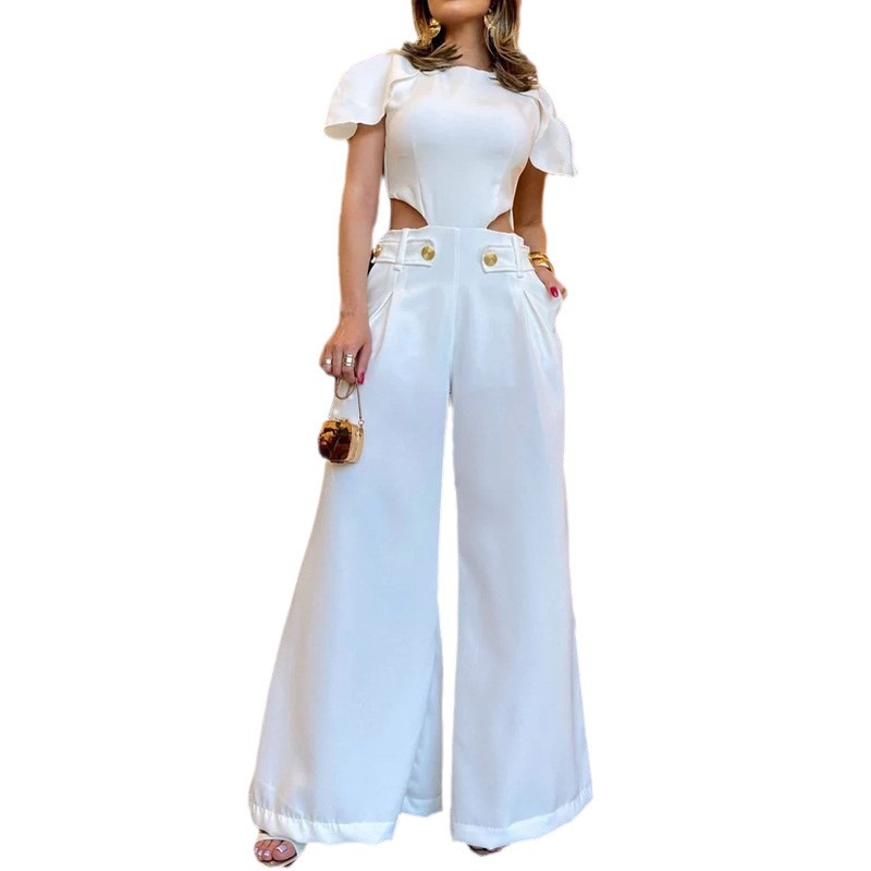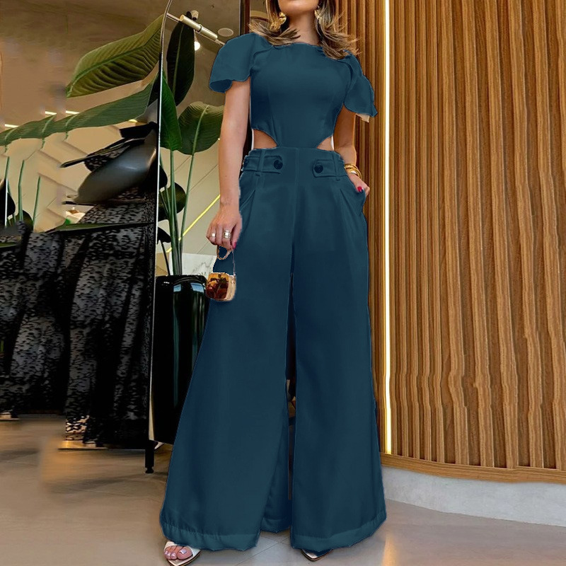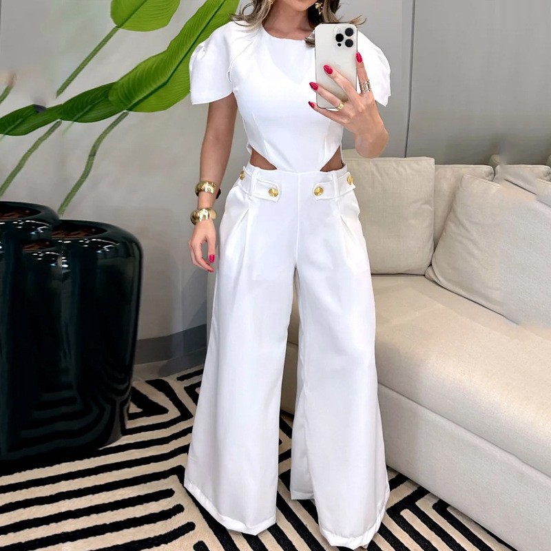| nameOriginal | 2024 Summer European and American fashion ripped button zipper waist hollow solid color loose wide leg jumpsuit |