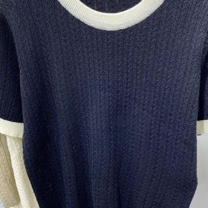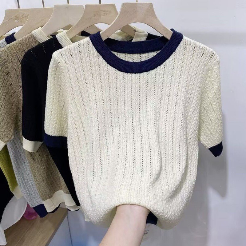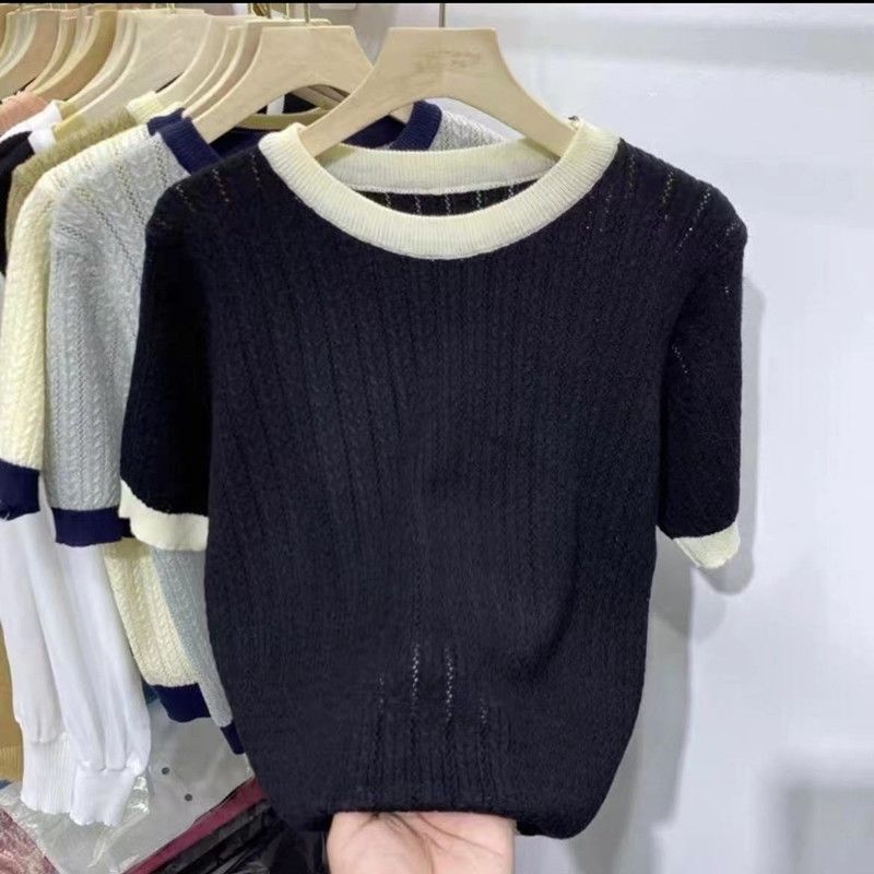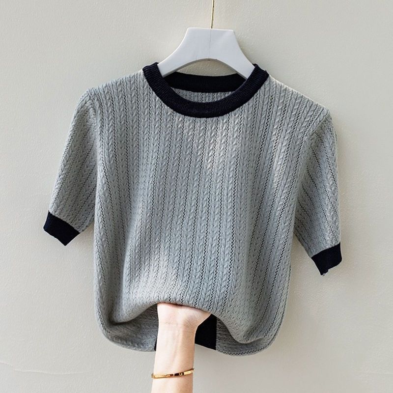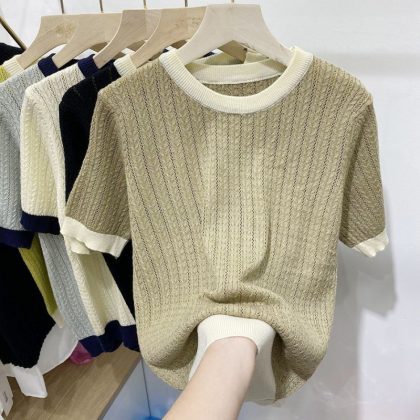 | nameOriginal | 2024 Summer Fashionable Knitted Shirt Women's Top Loose Slimming Western Style Color-matching Round Neck Short-sleeve Ice Silk T-shirt Thin |
