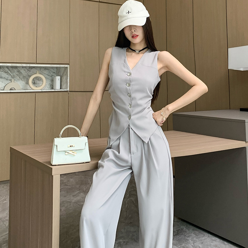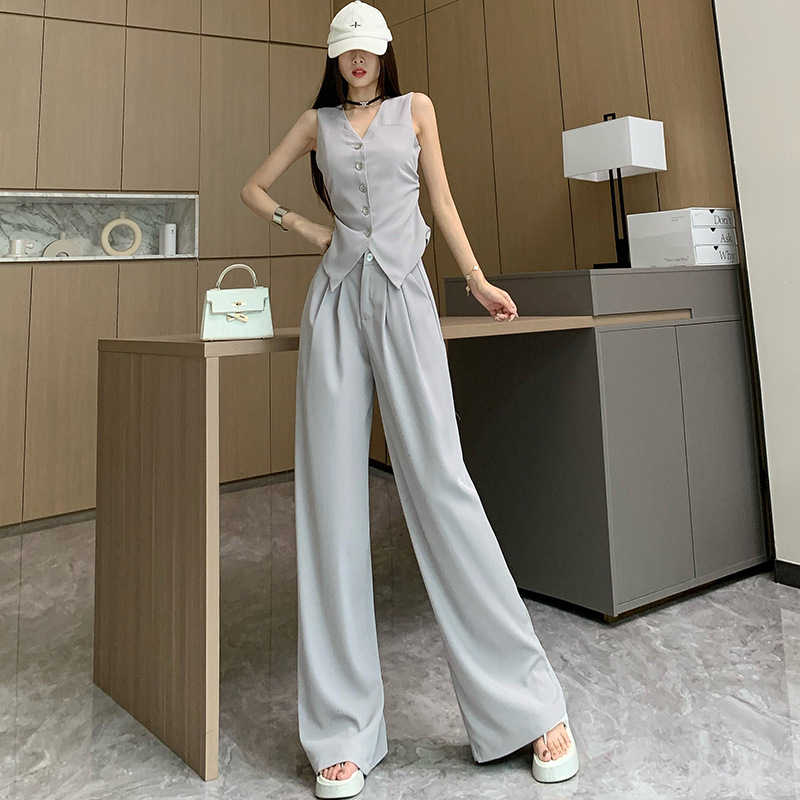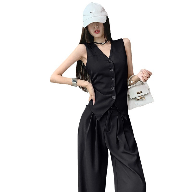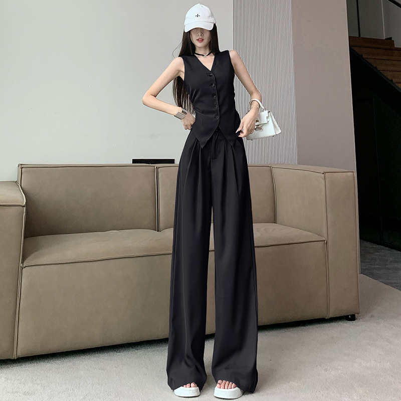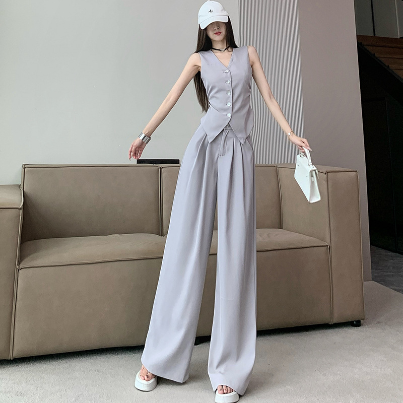 2024 Summer High-end Elegant Casual Sleeveless Suit Vest Top High Waist Slimming Straight Wide Two-piece Set